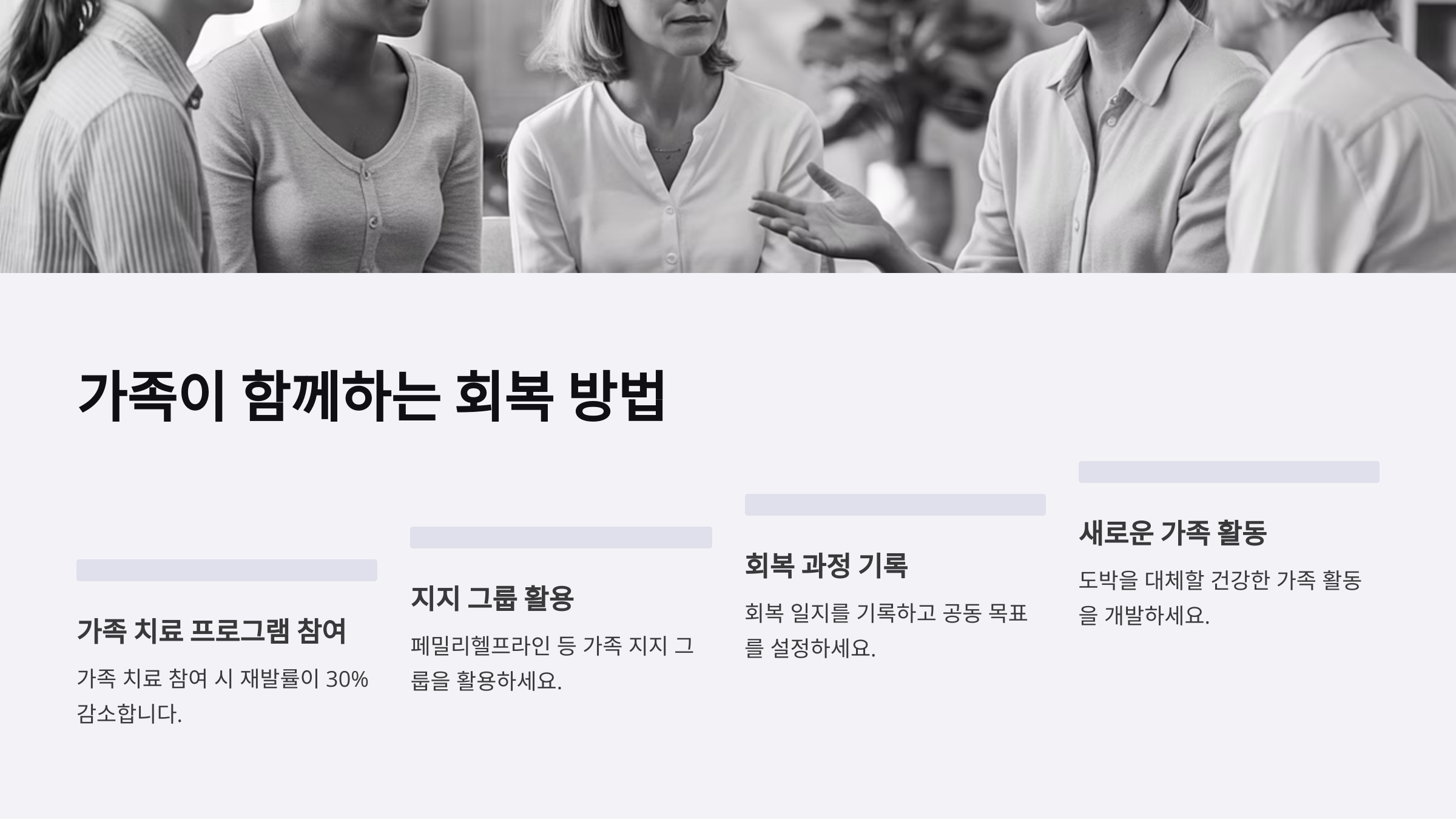 도박은 가족 모두의 삶을 잠식해요. 문제를 외면하거나 혼자 해결하려 하기보다, ‘우리 모두의 문제’로 인식하고 함께 회복의 방향을 찾는 게 중요해요.