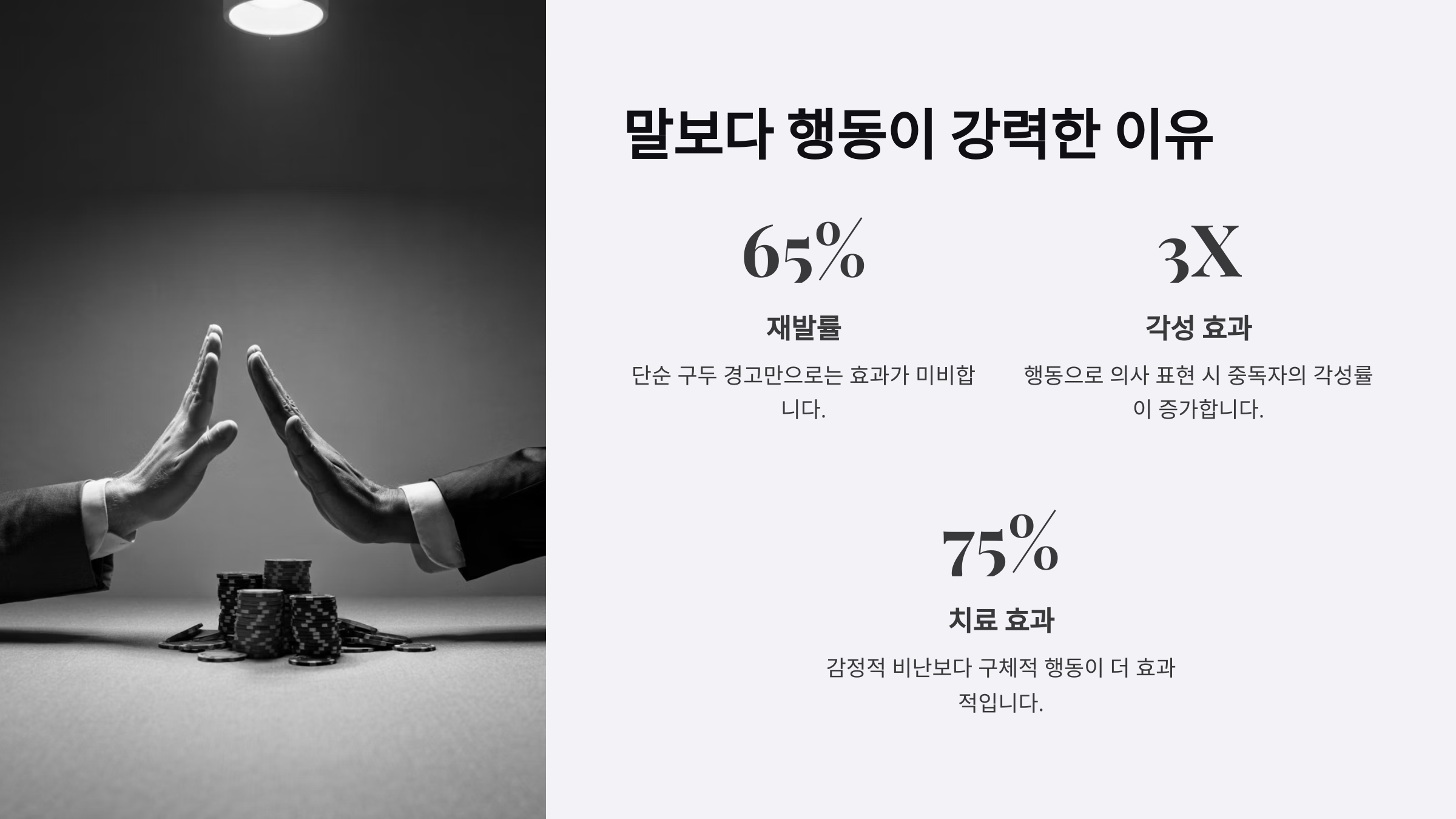 가족이 도박을 끊게 하려면 수백 번의 말보다 한 번의 행동이 훨씬 강력해요. 왜냐하면 도박 중독자는 이미 스스로 상황을 통제할 수 없는 상태에 있기 때문이죠.