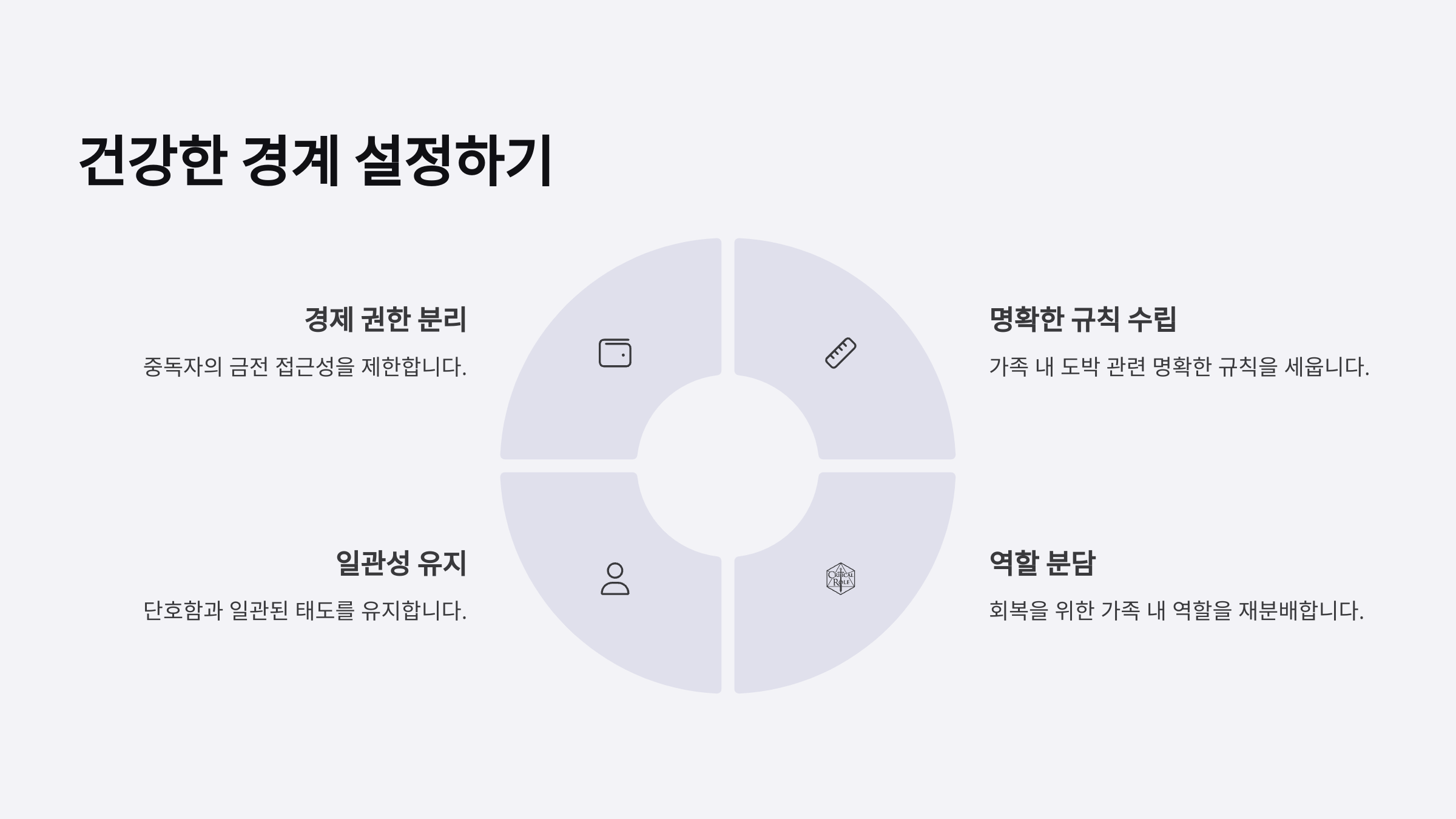 도박 중독 가족을 돕기 위해 가장 중요한 건 '건강한 경계'를 설정하는 거예요. 무조건적인 지원이나 방임은 중독을 심화시킬 뿐이에요.