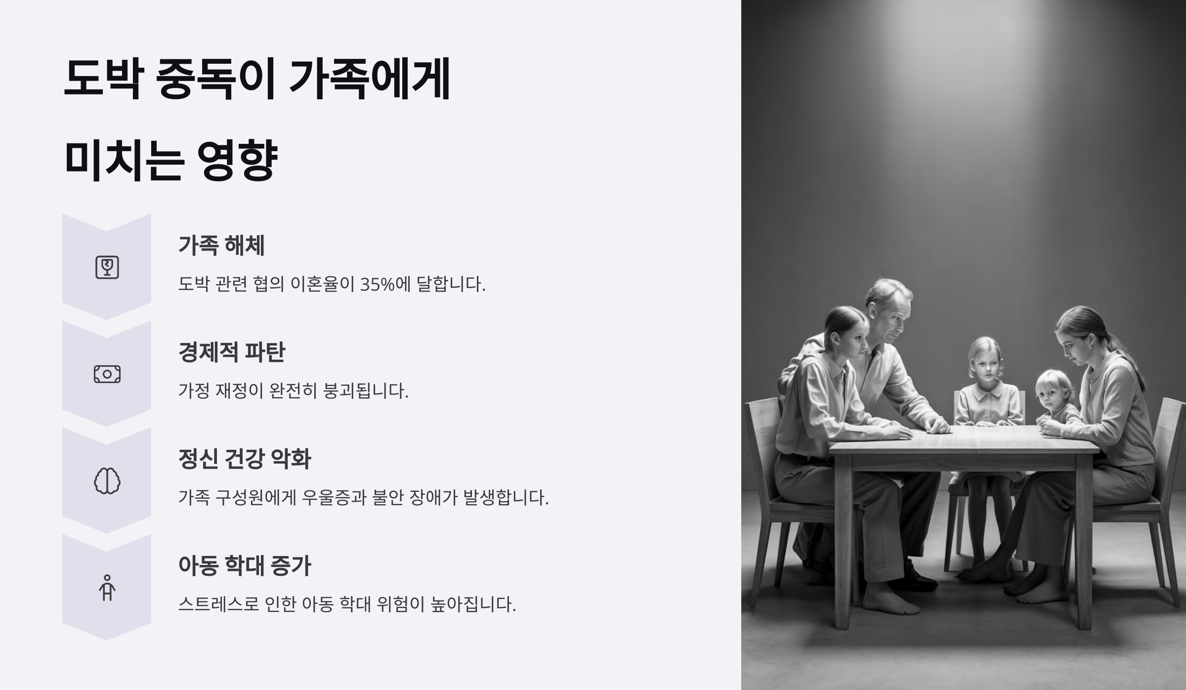 도박 중독은 단순히 개인의 문제가 아니라, 가족 전체에 깊은 상처를 남겨요. 감정적으로는 불신, 분노, 슬픔이 반복되고, 경제적으로는 생계 자체가 흔들릴 수 있어요.