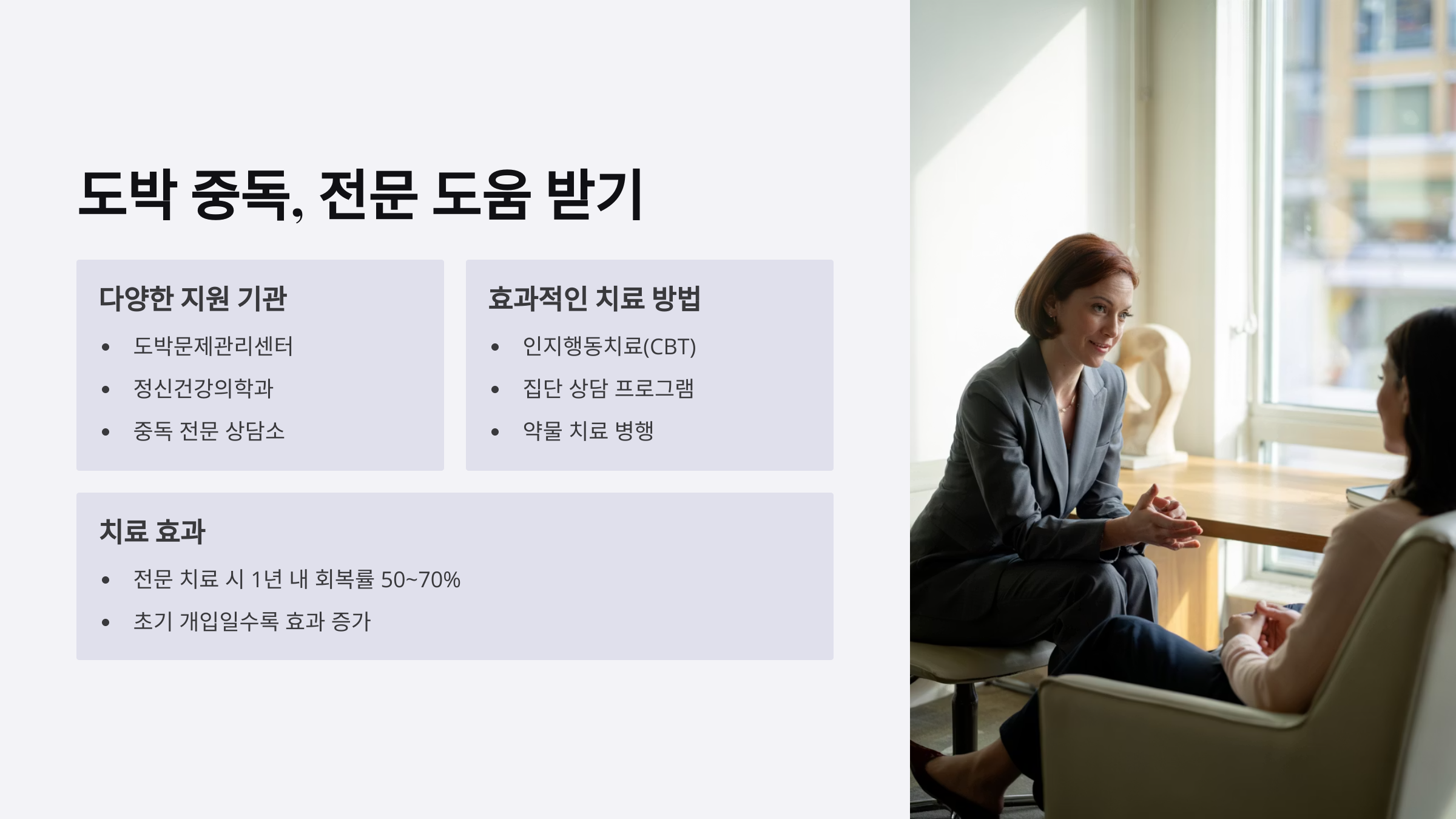 한국에서는 도박문제관리센터, 정신건강복지센터 등에서 무료로 상담과 치료를 지원하고 있어요. 전문 기관을 이용하면 체계적인 진단과 개인별 맞춤 치료 계획을 세울 수 있어요.