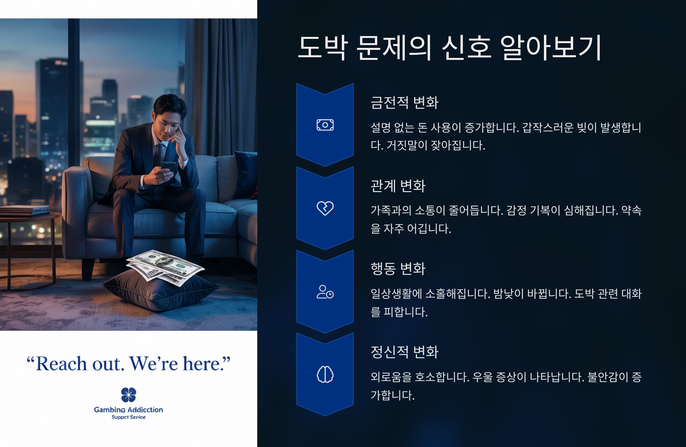 특히 요즘은 스포츠베팅, 온라인 카지노 등 접근이 쉬운 도박 형태가 많아져서, 문제를 더 빠르게 심화시키는 경향이 있어요. 미리 알고 경계하는 게 정말 중요해요! 🚨