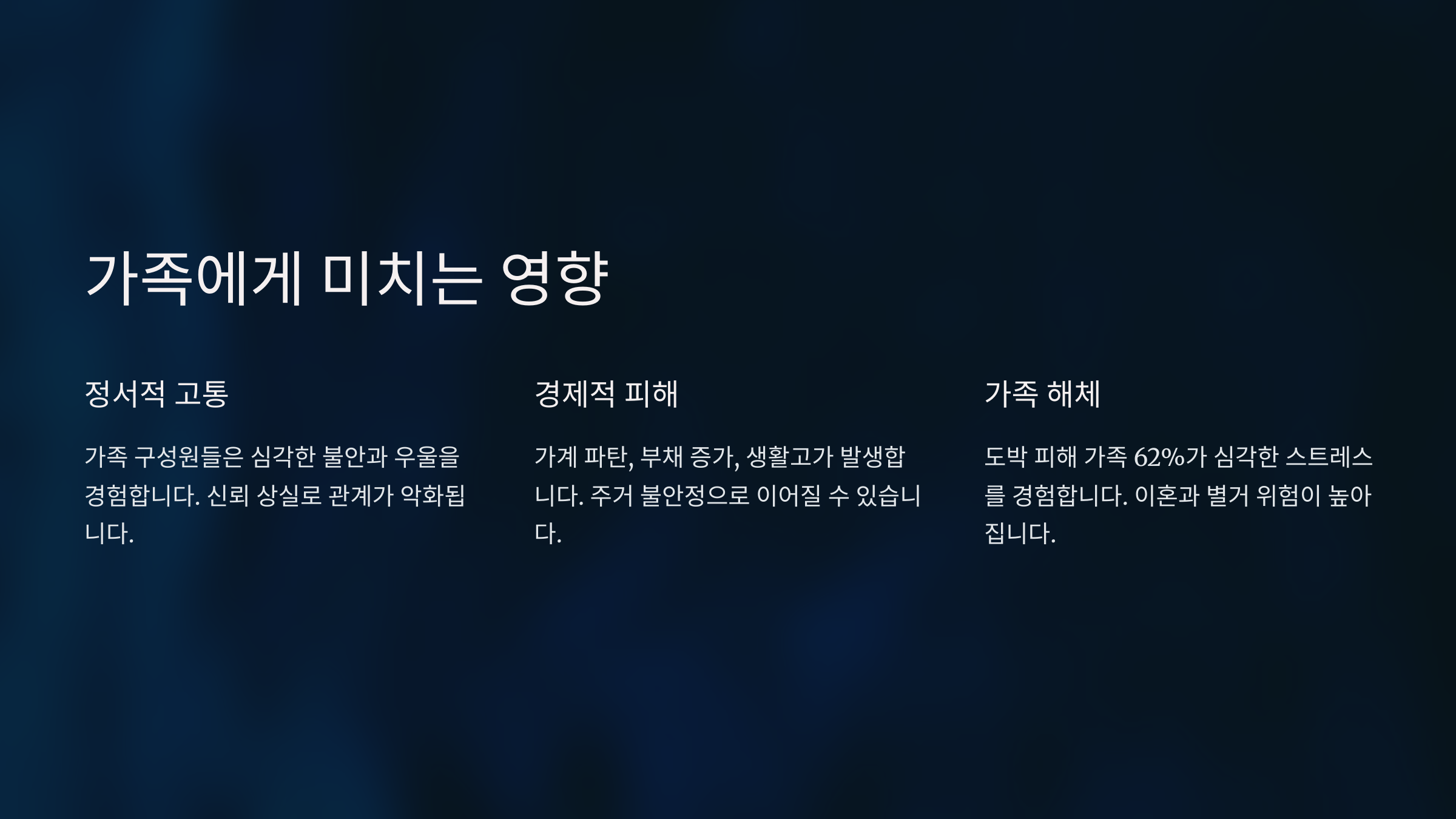 가족 중 누군가가 도박 문제를 겪게 되면, 가족 모두가 심리적, 경제적, 정서적으로 큰 충격을 받게 돼요. 단순히 돈을 잃는 문제가 아니라, 신뢰와 사랑이 깨지는 아픔이 따라오거든요.