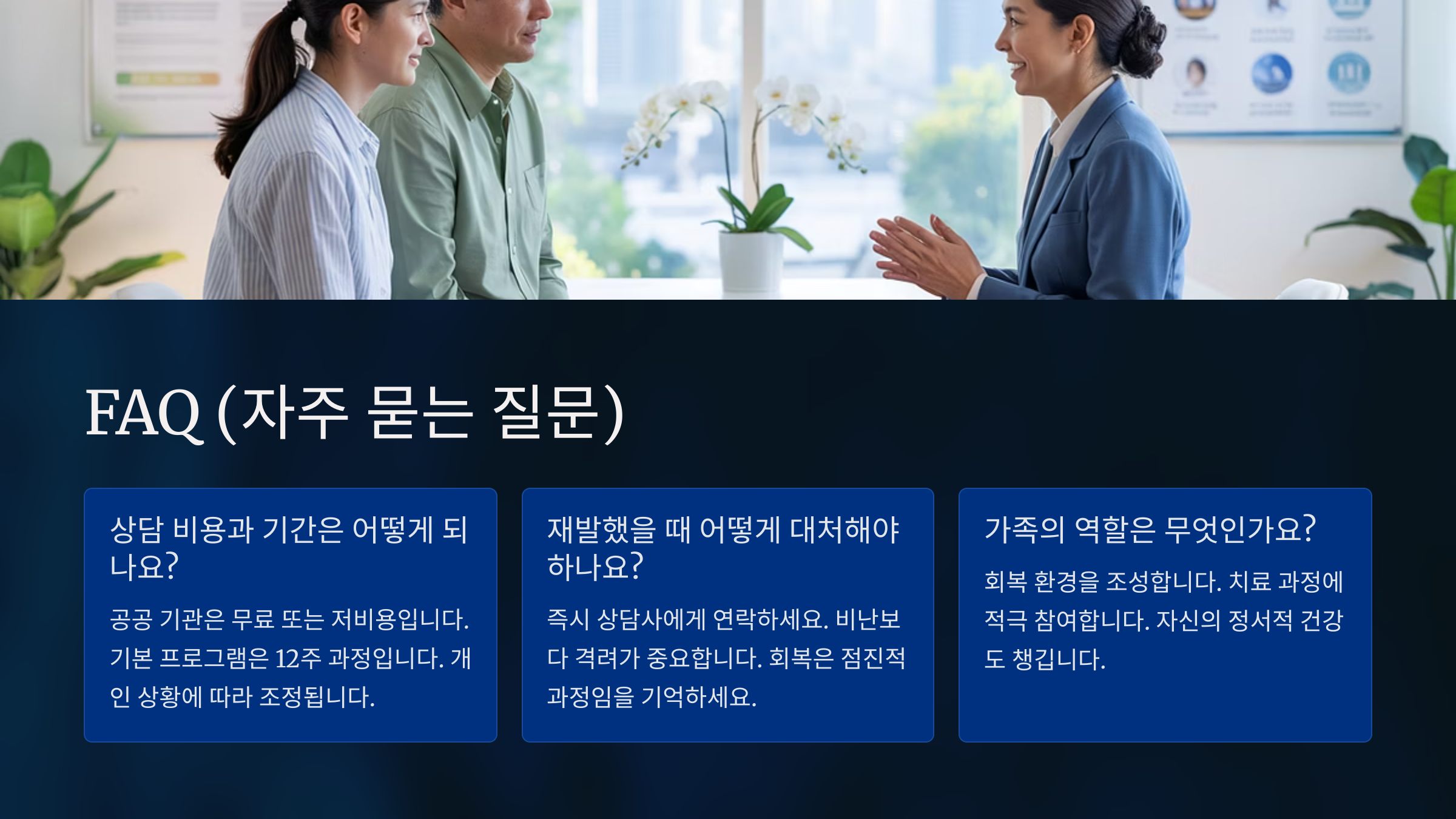 A2. 아니에요! 가족도 함께 상담을 받으면 문제 해결에 훨씬 큰 도움이 돼요.