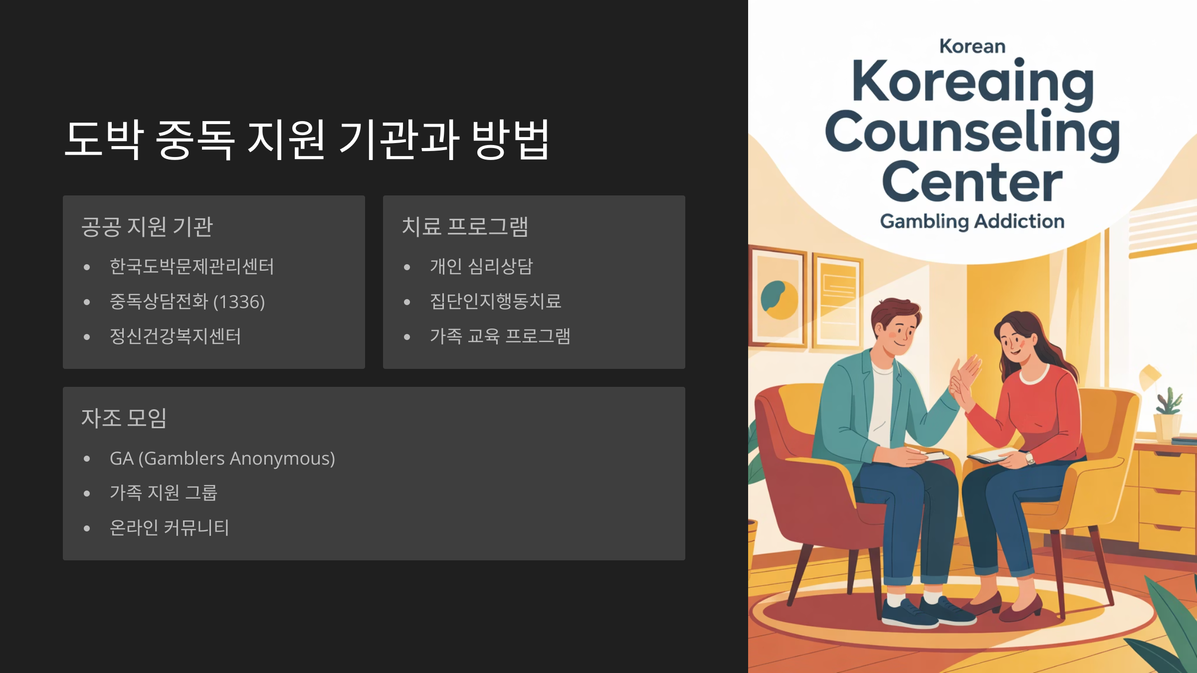 도박 문제는 개인의 힘만으로 극복하기 정말 어려워요. 그래서 전문적인 지원을 받는 게 무엇보다 중요해요. 한국에는 도박 문제를 전문적으로 다루는 기관들이 여럿 있어서 도움을 받을 수 있어요.