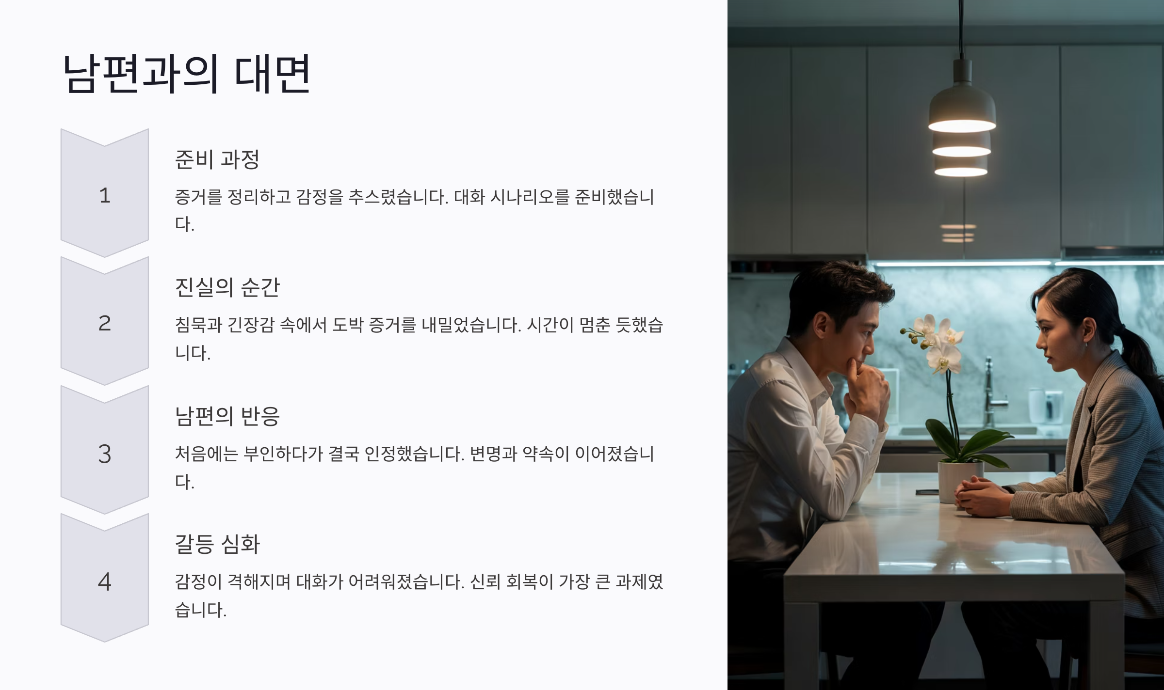 어느 날, 이상한 카드 명세서를 발견하면서 모든 퍼즐이 맞춰지기 시작했어요. 숨겨진 계좌, 반복되는 현금 인출, 그리고 설명할 수 없는 빈번한 외출. 작은 의심들이 쌓이고 쌓여서 결국 '확신'이 되어버린 순간, 심장이 철렁 내려앉는 느낌이었어요.