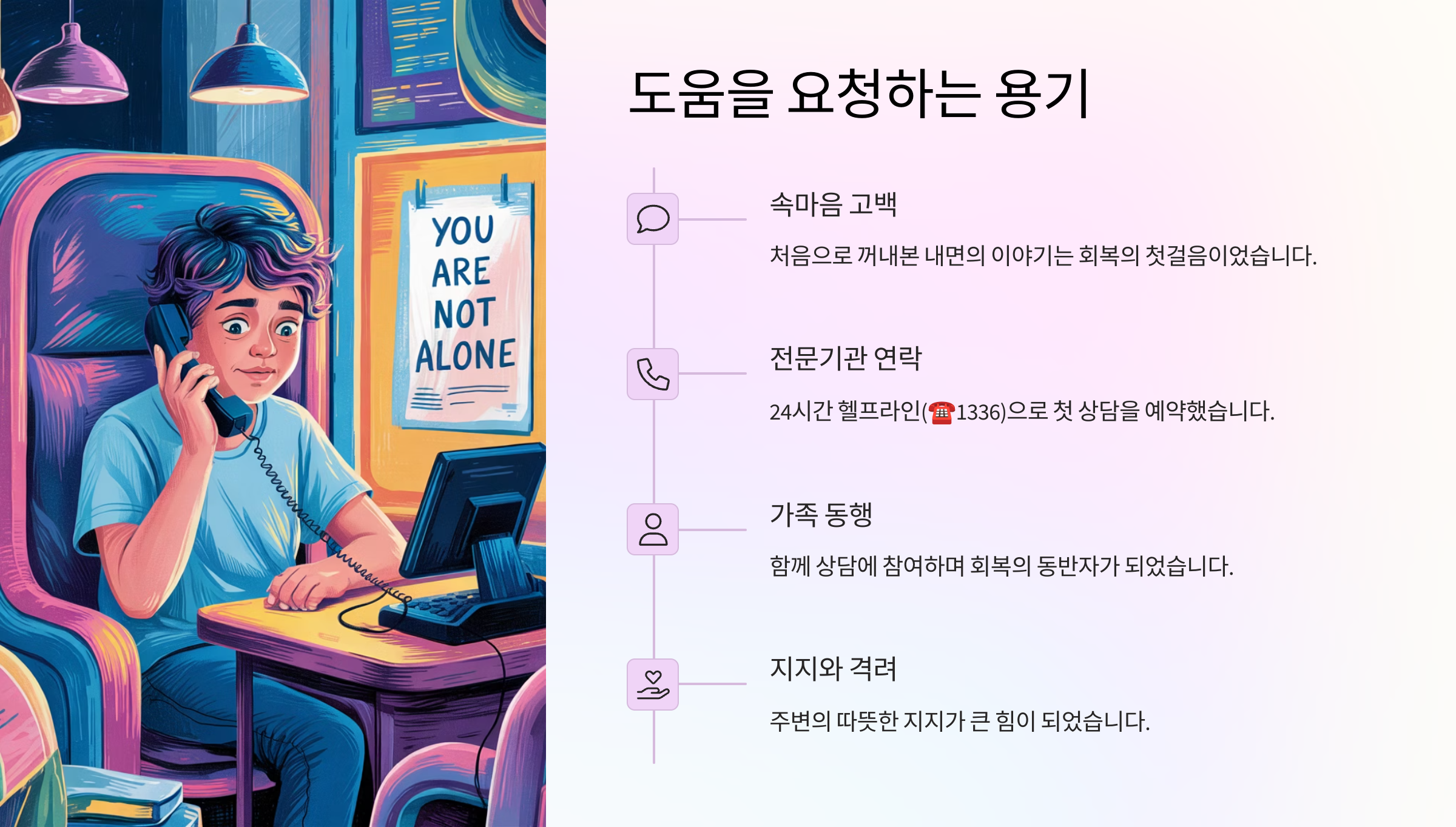 처음엔 정말 어디에 도움을 청해야 할지 몰랐어요. 부끄럽고 창피하다는 생각에 아무에게도 말하지 못했거든요. 하지만 혼자서는 절대 감당할 수 없다는 걸 깨닫고, 저는 지역 정신건강센터에 전화를 걸었어요.