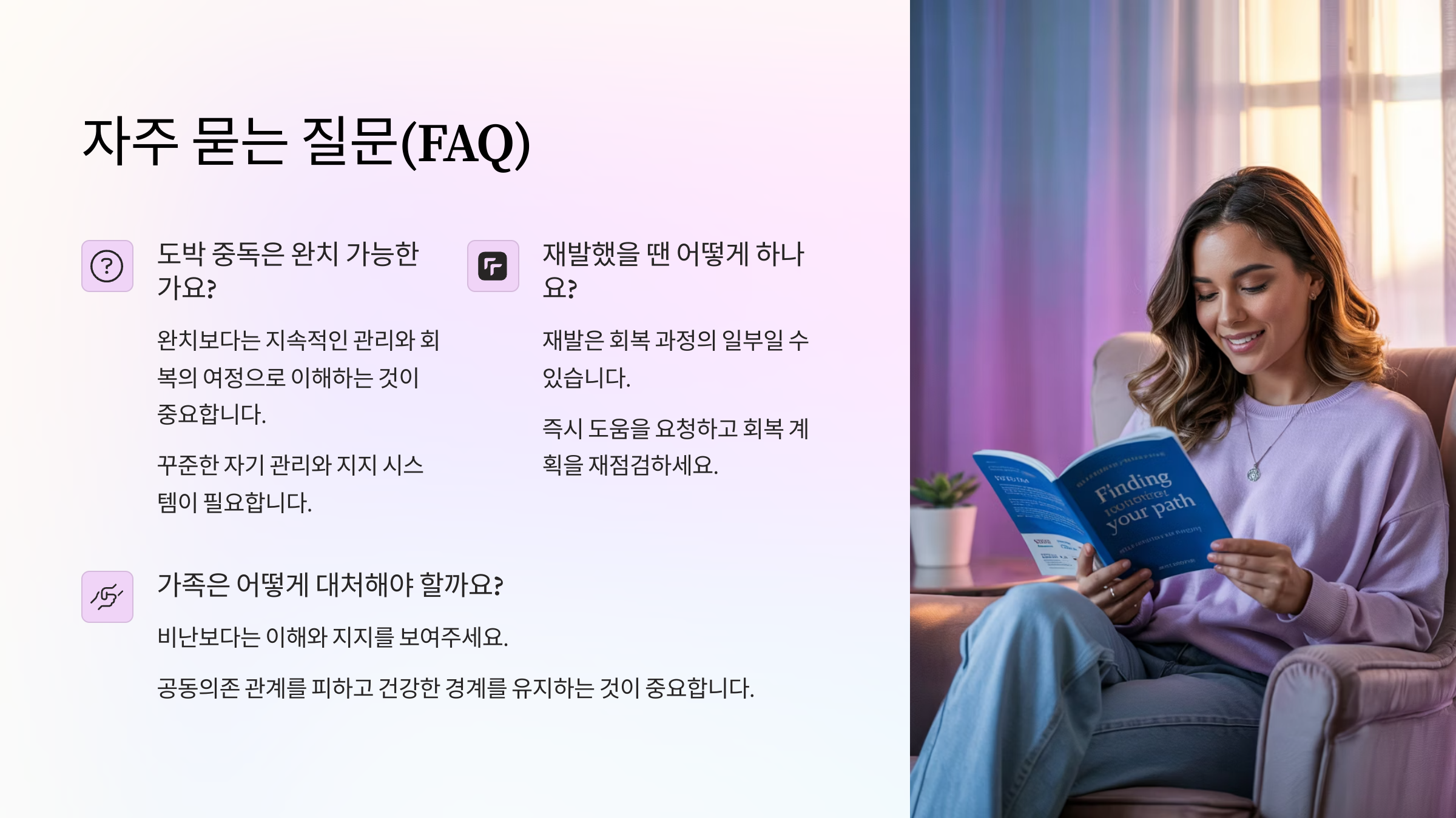 남편의 회복은 하루아침에 이루어지지 않았어요. 중간에 몇 번은 다시 도박에 손을 대려는 시도도 있었고, 그때마다 저는 다시 무너지는 기분이었죠. 하지만 중요한 건 ‘실패해도 다시 시작할 수 있다’는 믿음이었어요.