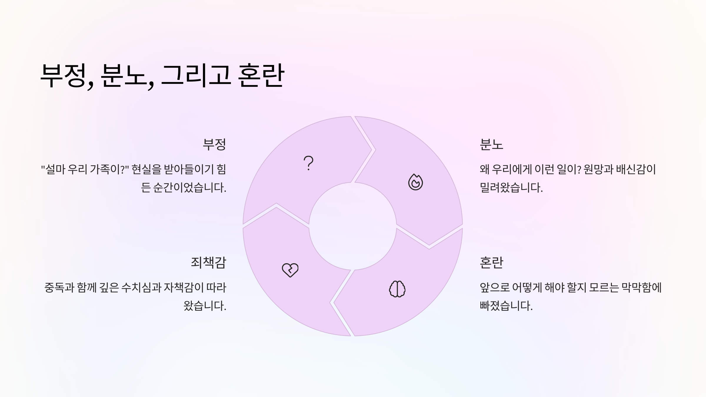 초기 (알게 된 날) 충격, 배신감 정신적 마비 이혼 고민 1~2주 후 분노, 슬픔 감정 기복 격렬한 말다툼 1개월 후 혼란, 걱정 회복 모색 전문가 검색 현재 희망, 경계 정서적 관리 소통 노력 표에 보이듯, 가족의 감정은 도박 중독 회복 과정에서 매 순간 변화해요. 단순히 ‘화난다’는 감정으로만 접근하면 중독자도, 가족도 모두 지치게 돼요. 그래서 저는 그때부터 가족상담도 함께 받기로 결심했답니다.