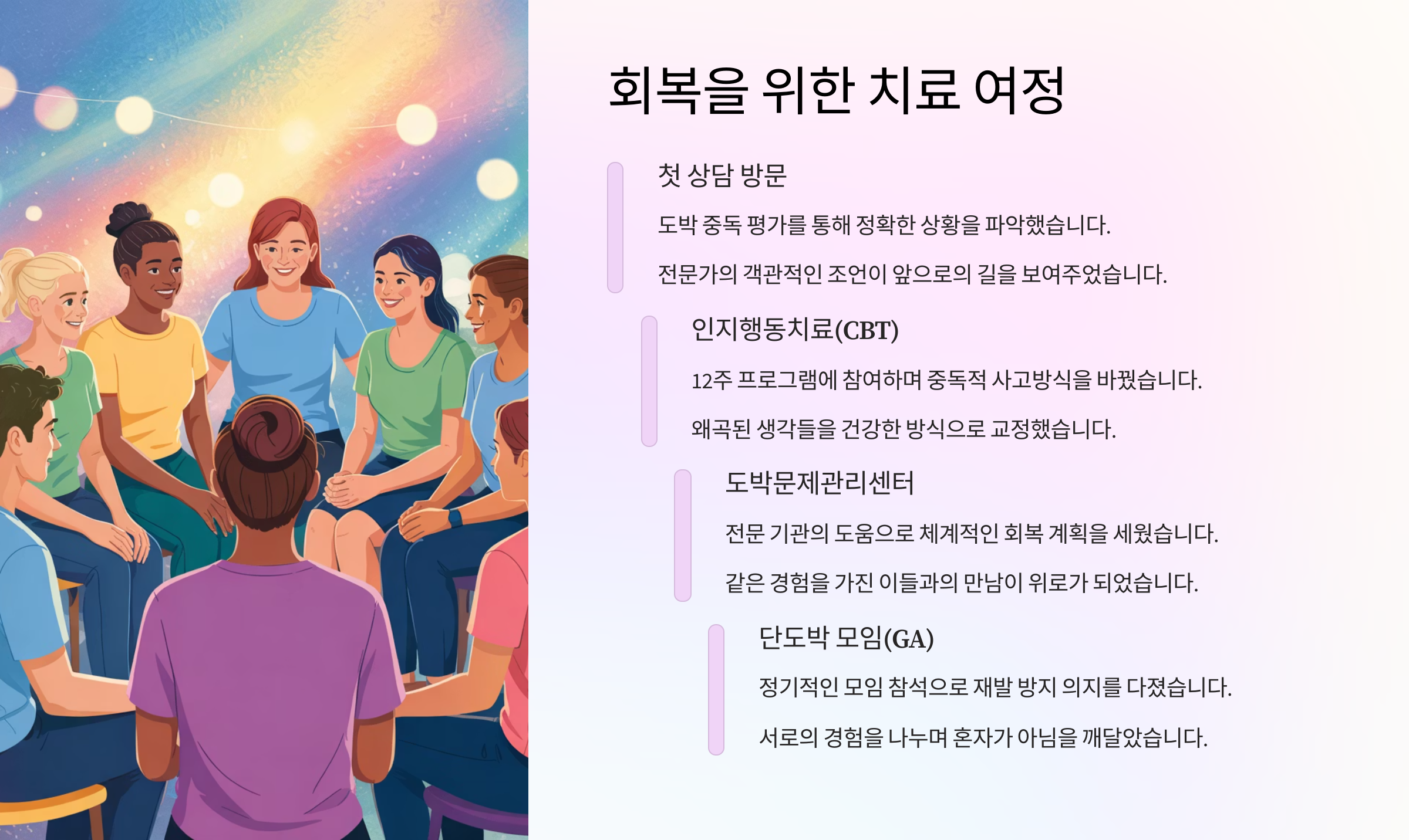 그 전화 한 통이 정말 많은 걸 바꿨어요. 담당자 분은 친절하게 도박 중독에 특화된 병원과 상담소를 안내해줬고, 남편도 저와 함께 상담을 받기 시작했어요. 물론 처음엔 치료를 거부하려 했지만, 제가 계속해서 설득하며 동행했답니다.