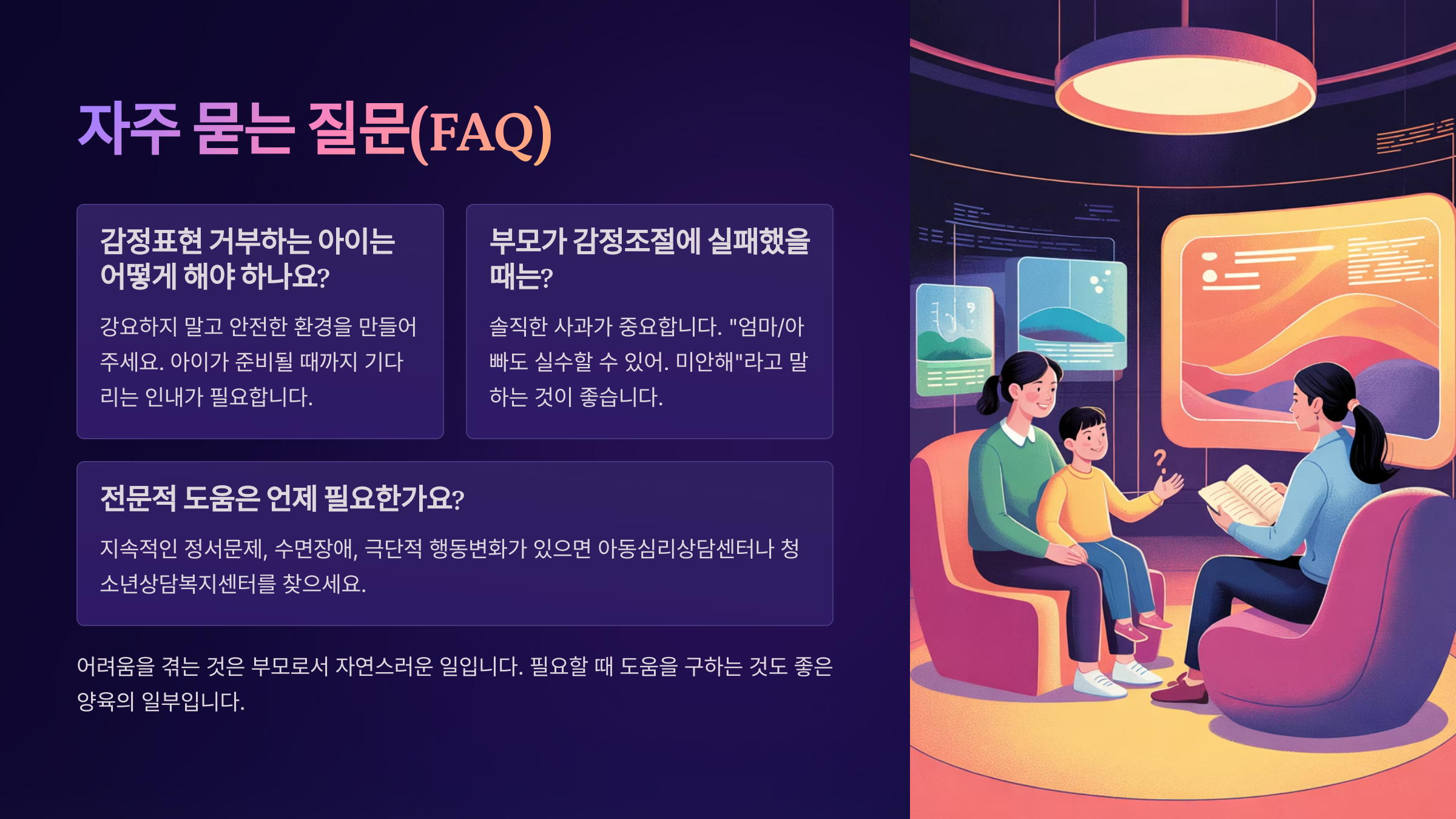 가족 전체가 함께 감정을 나누는 문화가 형성되면, 아이도 자신의 감정을 건강하게 받아들이게 돼요. “오늘 하루 어땠어?”라는 질문이 자연스러운 일상이 된다면, 아이는 언제든지 자신의 감정을 표현할 수 있는 안전한 울타리를 느끼게 된답니다.