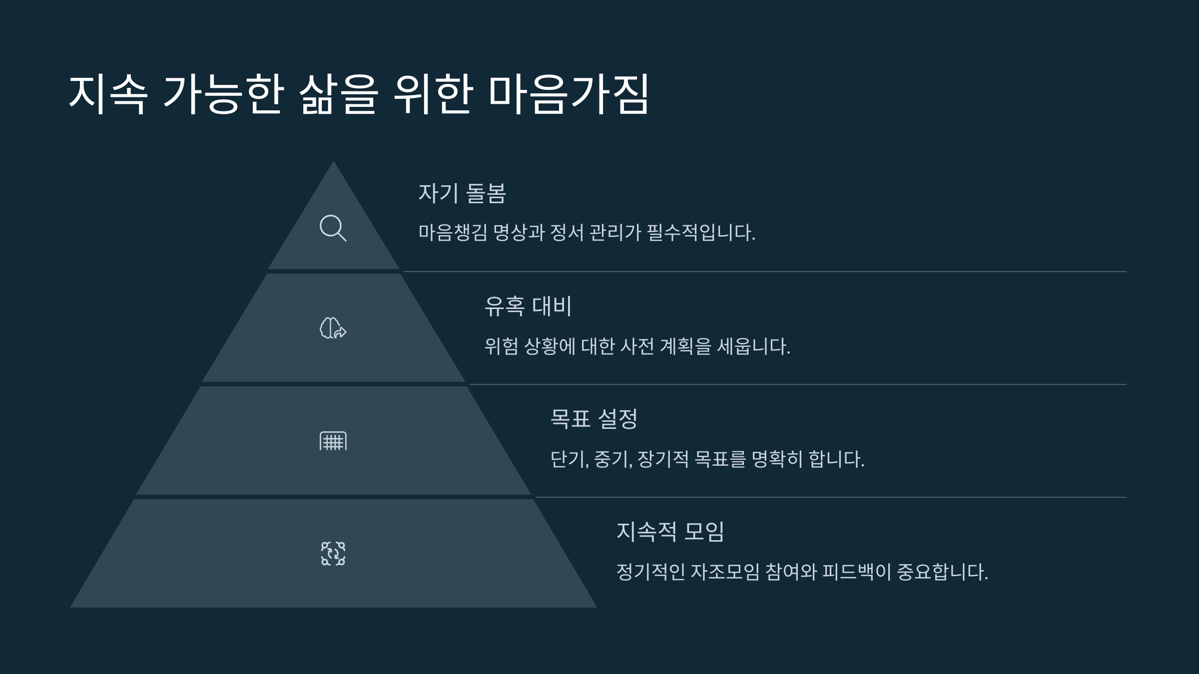 꾸준한 노력 하루하루 성실하게 목표 관리 가족과 주변의 지지 응원과 믿음으로 버팀목 역할 새로운 목표 설정 직업훈련, 학습 등으로 삶 리셋 🧠 지속 가능한 삶을 위한 마음가짐