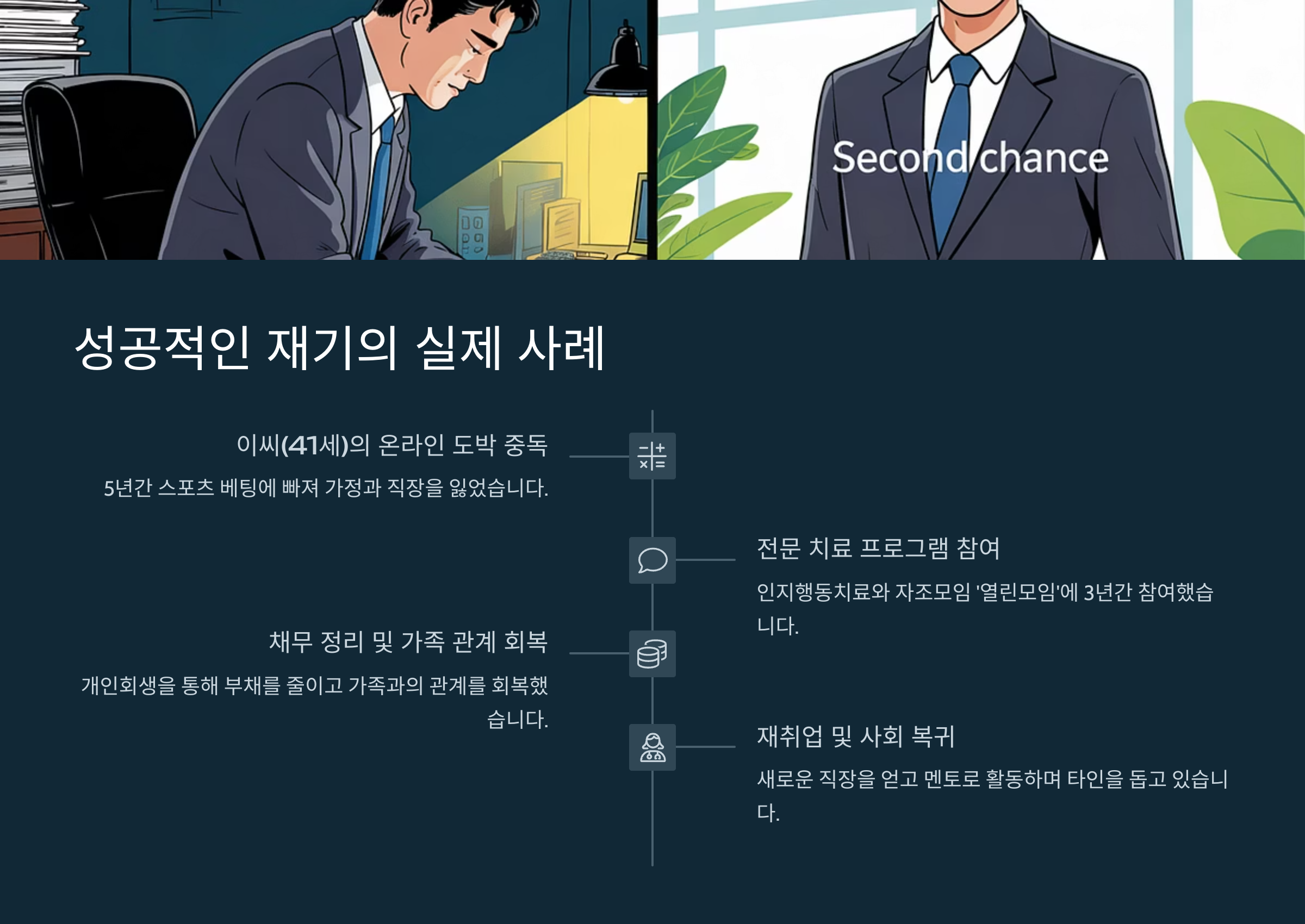 세상에는 도박으로 무너졌다가도 다시 일어난 사람들이 정말 많아요. 이들의 공통점은 절대 포기하지 않고, 도움을 적극적으로 받았다는 거예요.