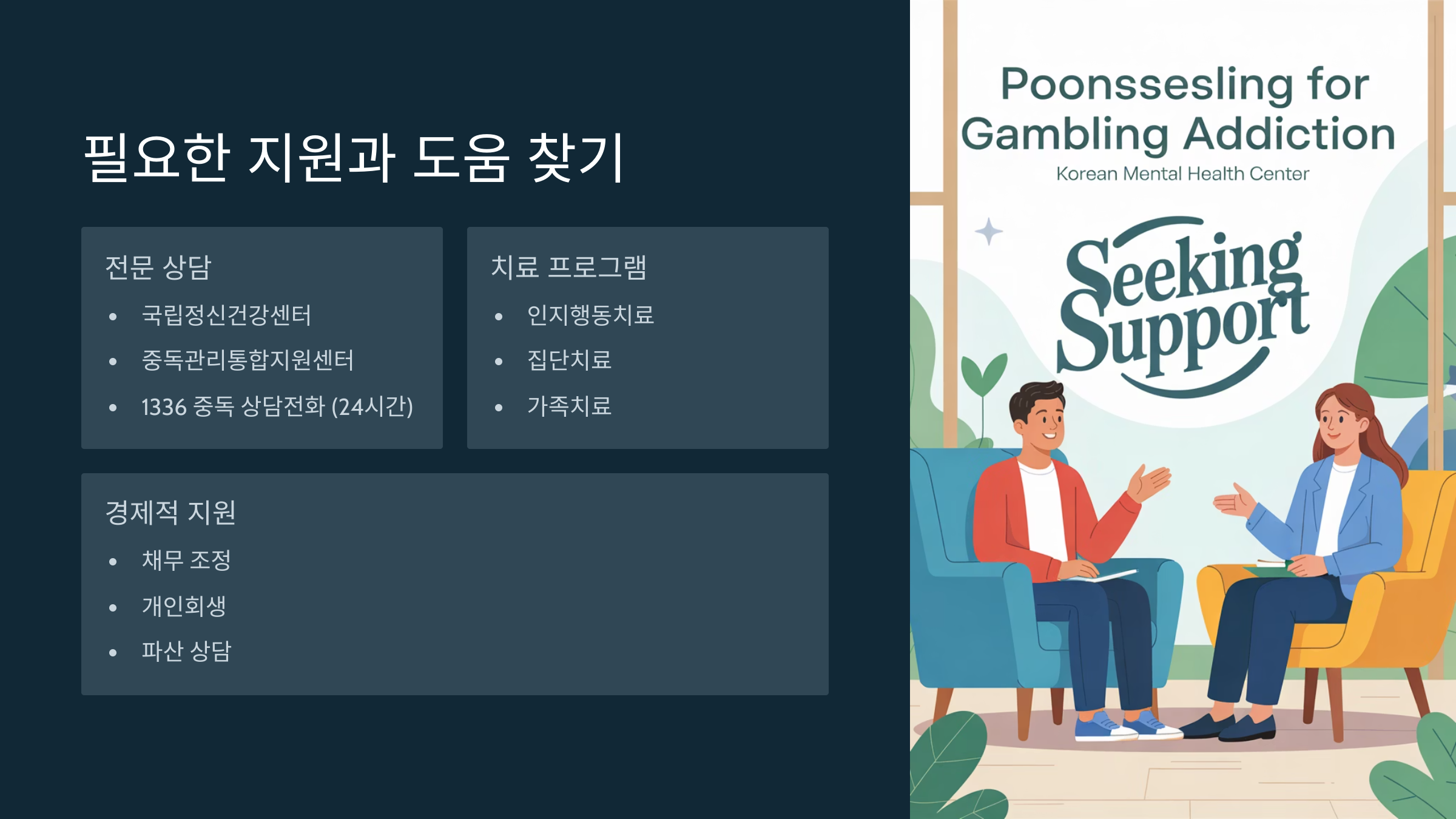 한국에는 '도박문제관리센터' 같은 공공기관도 운영 중이에요. 이런 곳은 무료로 상담해주고, 필요한 경우 입원 치료까지 연결해줘요.