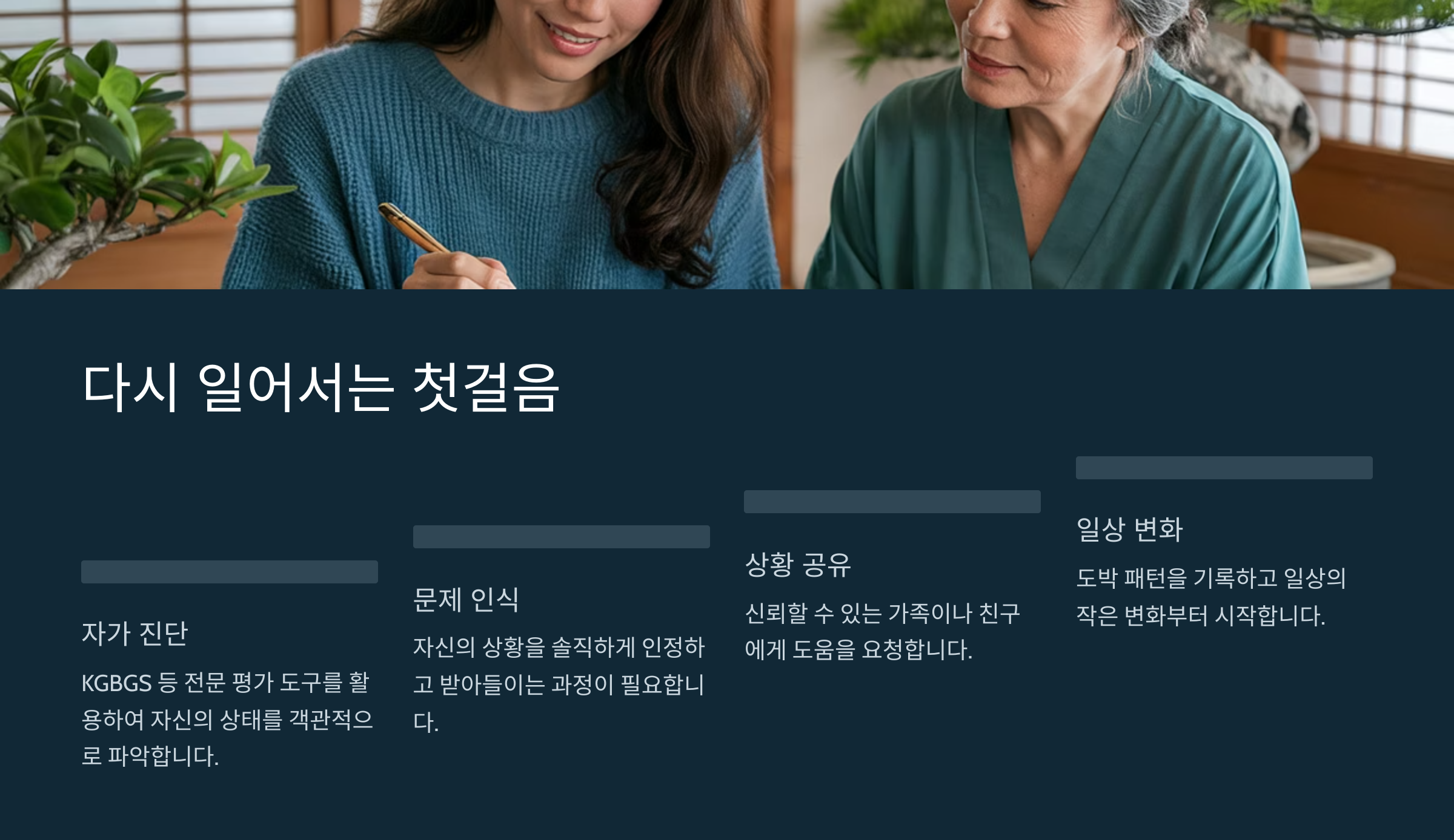 도박에서 벗어나는 첫걸음은 "나는 변화할 수 있다"는 믿음이에요. 과거가 어떻든 간에, 지금 이 순간부터 새롭게 시작할 수 있어요. 포기하지 않는 마음이 제일 중요해요.