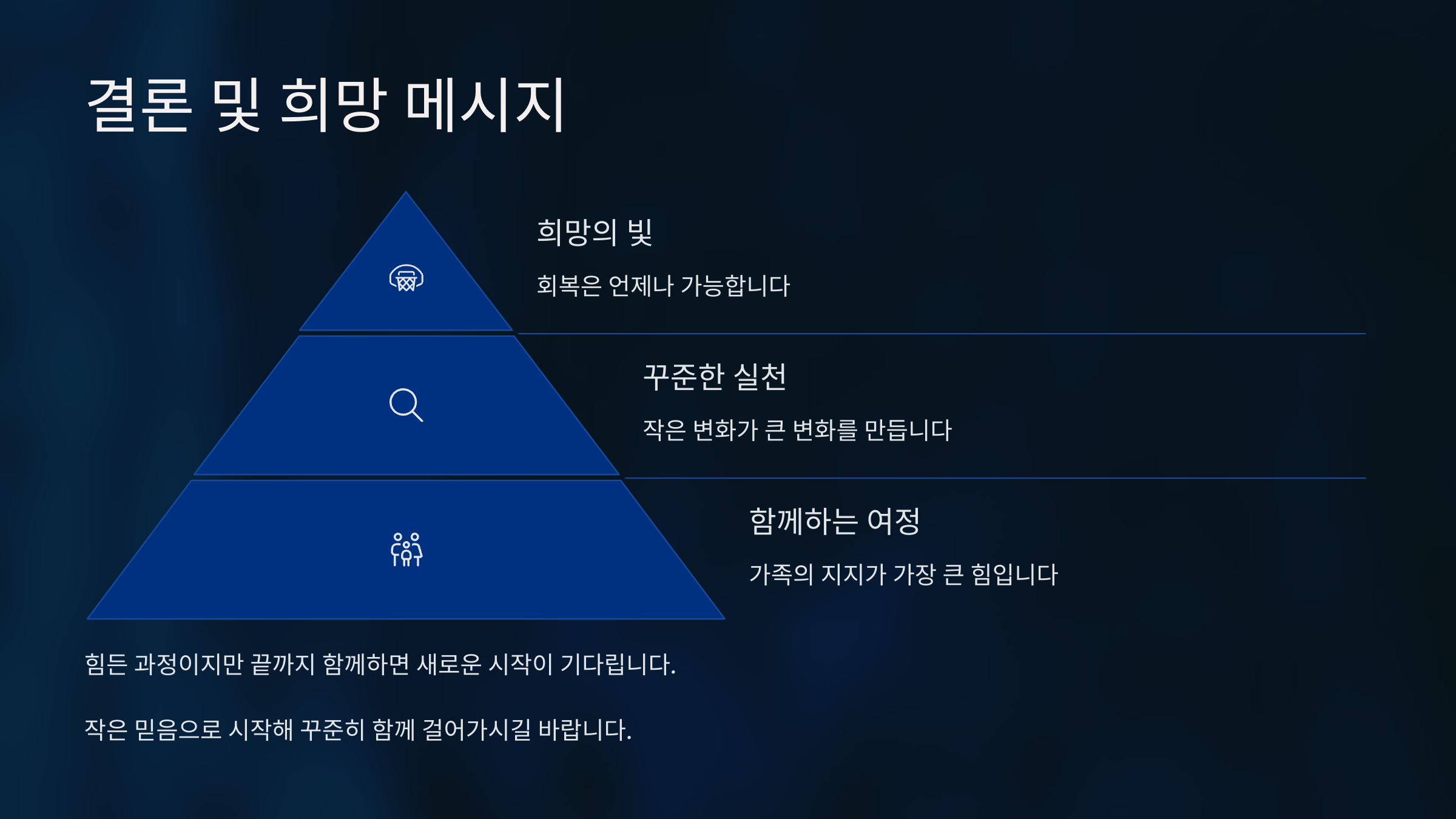 작은 성취 칭찬하기 아주 작은 변화도 긍정적으로 바라보기 인정과 격려 긍정적인 미래 상상 희망적인 미래를 구체적으로 떠올리기 목표 설정 함께 울고 웃기 감정 공유로 관계 강화 진심 어린 공감 희망은 멀리 있는 게 아니에요. 바로 오늘, 지금, 우리 안에 있어요. 아들과 함께 이 길을 걸어가는 동안, 나는 매일 희망을 발견해요. 그리고 그 희망을 꼭 붙잡고 앞으로 나아가요.