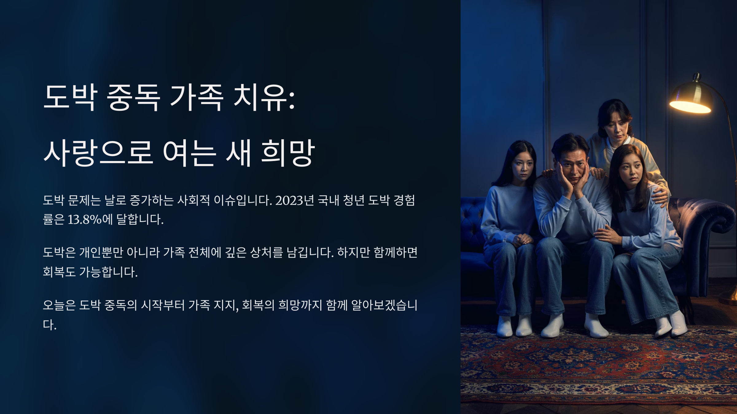 도박은 한 사람만의 문제가 아니었어요. 가족 전체가 끌려 들어가고, 상처받고, 고통스러웠어요. 하지만 다시 시작할 기회는 분명 필요하다고 믿었어요. 내가 생각했을 때, 가족의 믿음이야말로 다시 일어설 힘을 만들어 주는 것 같아요.