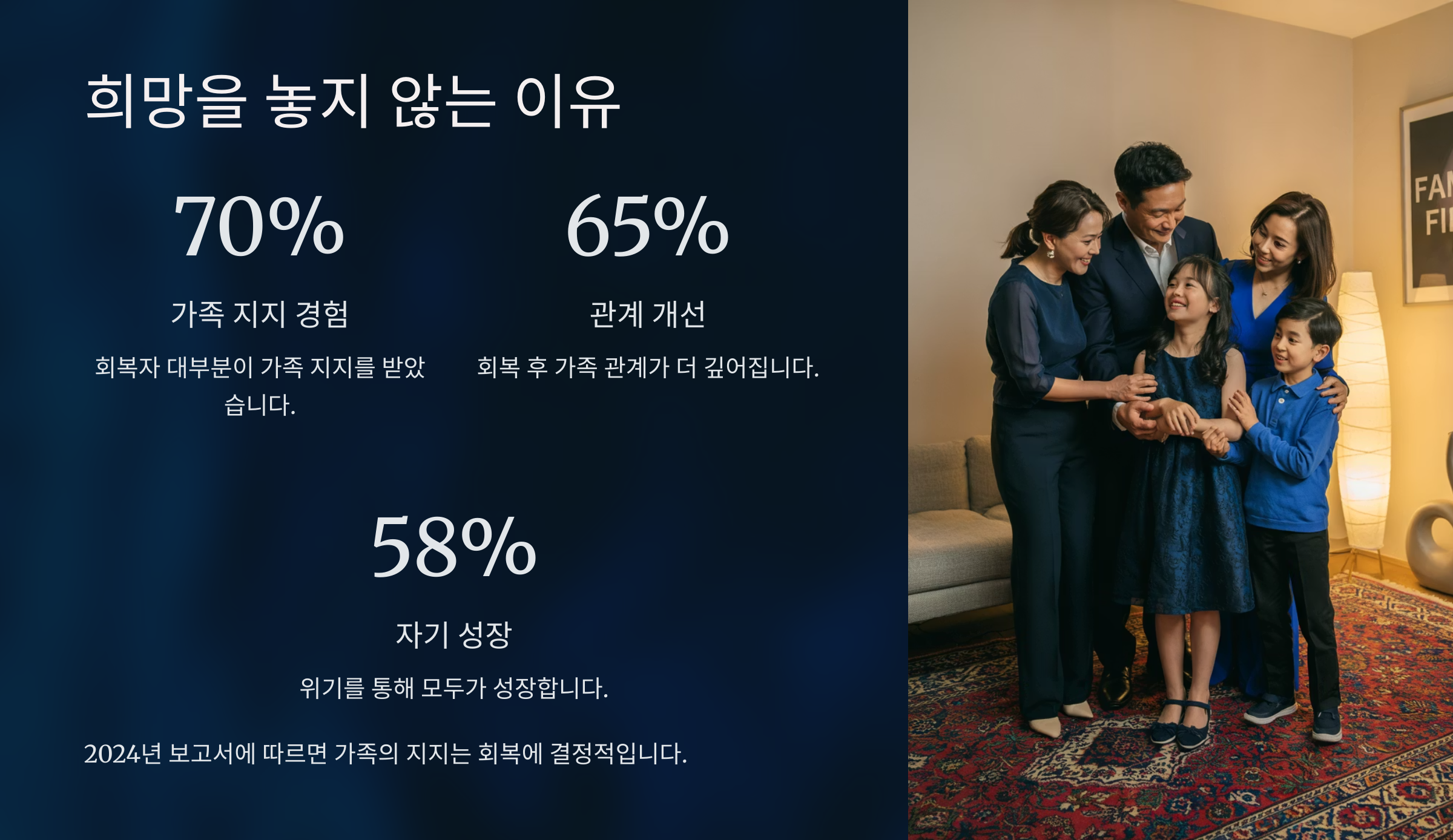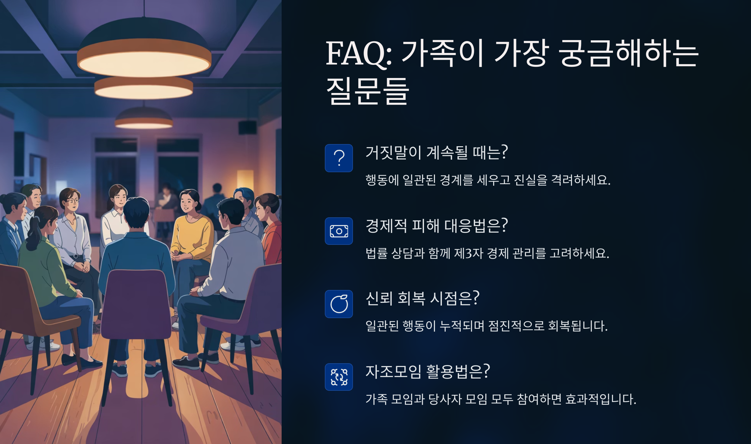 이해와 수용 치료 시작, 신뢰 회복 신뢰 회복 시간 필요 비난과 분노 각성 계기 제공 관계 악화, 재발 위험 가족의 첫 반응이 회복에 큰 영향을 미쳐요. 무조건적인 수용은 어렵지만, 따뜻한 지지와 현실적인 조언이 필요해요. 고백 자체가 큰 용기였다는 걸 기억해야 해요.