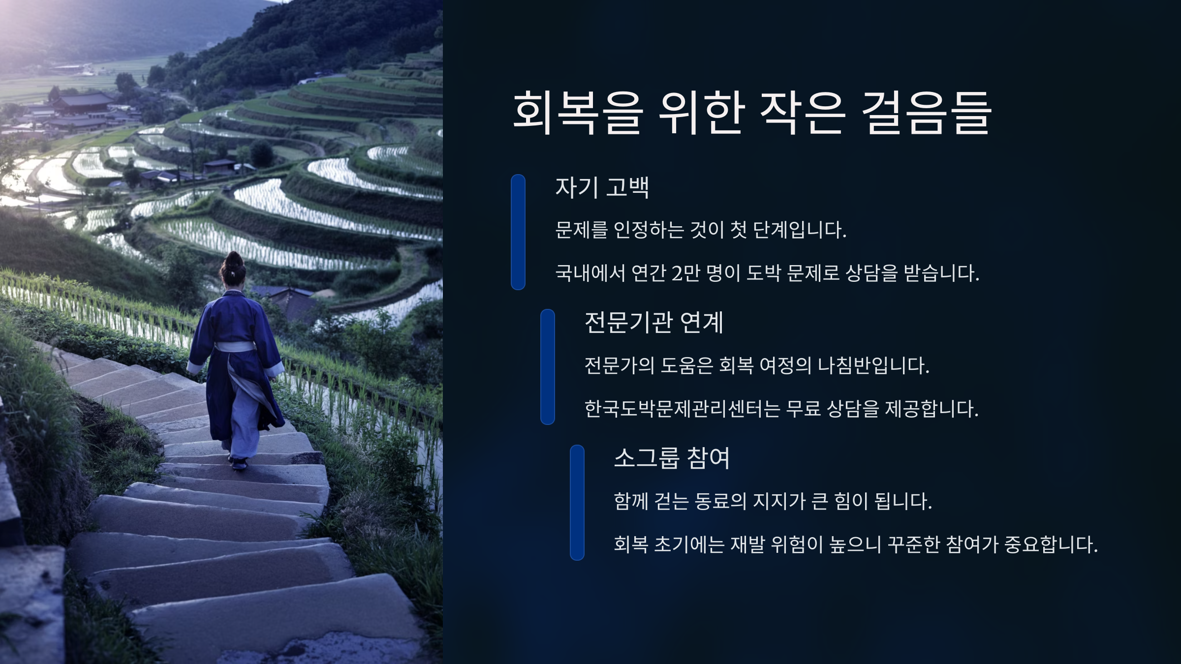 초기 호기심, 소액 베팅 게임, 내기 중기 상습적 도박, 빚 발생 거짓말, 숨김 말기 삶의 붕괴, 극단적 선택 가능성 사회적 고립, 절망감 이 표를 보면 알 수 있어요. 도박은 시간이 지나면서 반드시 악화돼요. 초기에 끊지 않으면, 감당하기 힘든 상황까지 몰리게 돼요. 그래서 초기에 알아채고 개입하는 게 정말 중요해요.