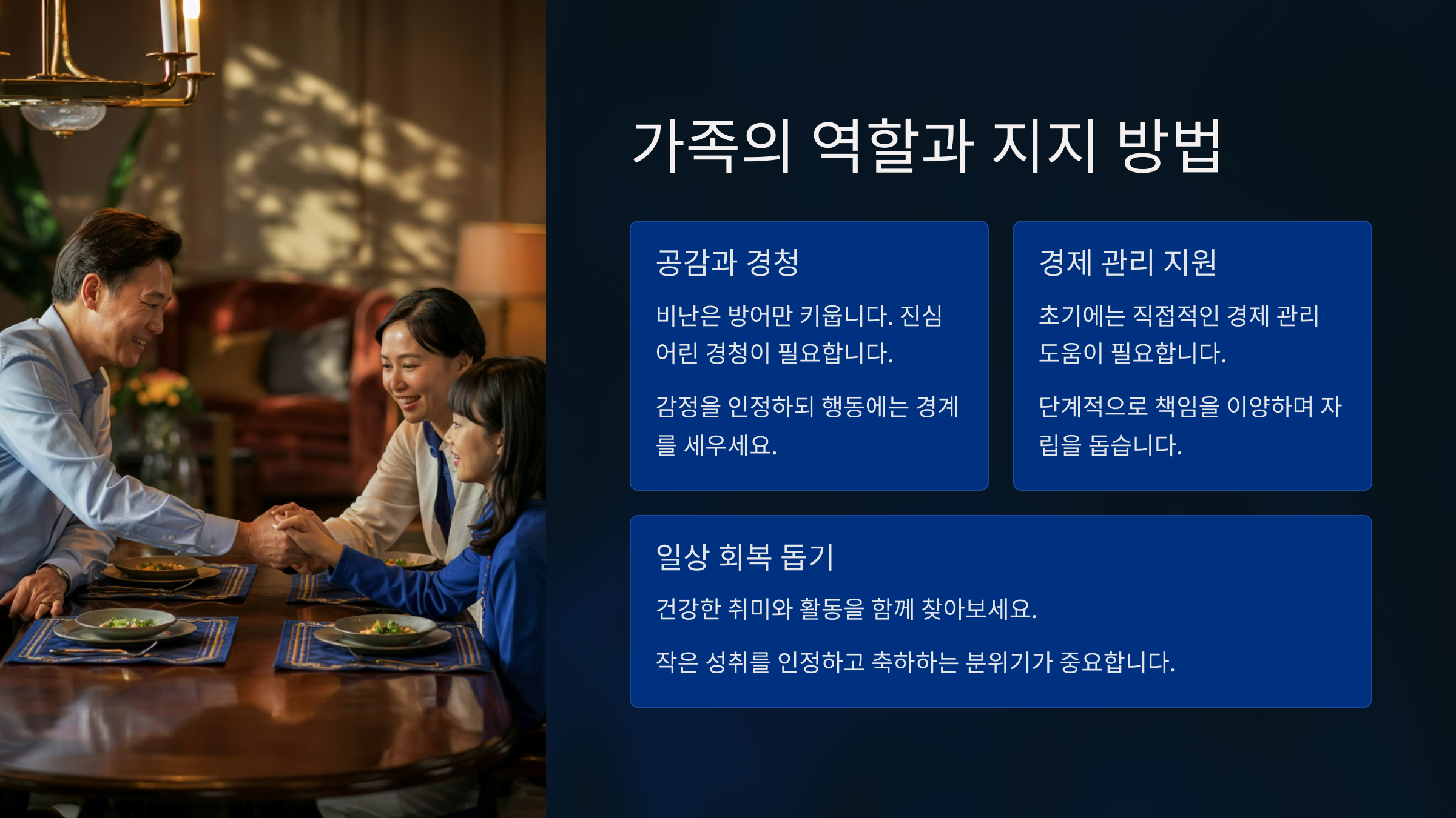 도박을 끊는 여정에서 가족은 정말 중요한 존재에요. 가족이 주는 지지와 신뢰는 말 그대로 아들의 인생을 다시 세우는 기둥이 되었어요. 우리는 비난 대신 경청하기로 했어요. "왜 그랬어?" 대신 "어떤 마음이었어?" 이렇게 물어봤어요. 질문 하나에도 진심이 담기도록 신경썼어요.