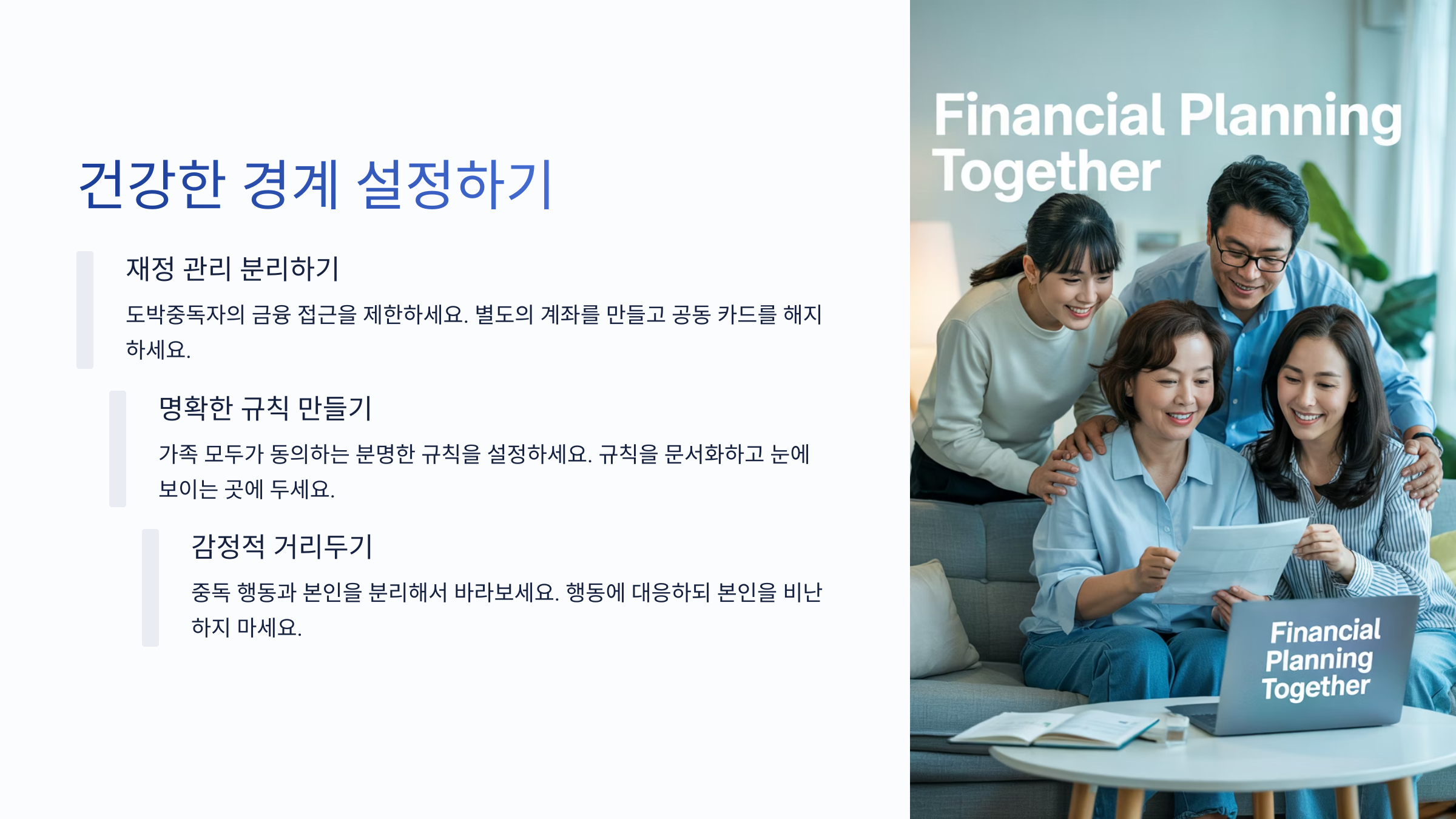 가족이 도박중독자에게 너무 많은 책임을 대신 져주거나, 모든 문제를 감싸주면 오히려 중독이 심해질 수 있어요. 그래서 필요한 게 바로 '건강한 경계(Boundaries)'를 세우는 거예요.예를 들어, 돈을 빌려달라고 요청할 때마다 들어주지 않는 것도 경계 설정의 한 방법이에요. 이건 냉정한 행동이 아니라, 오히려 사랑의 표현이 될 수 있어요.