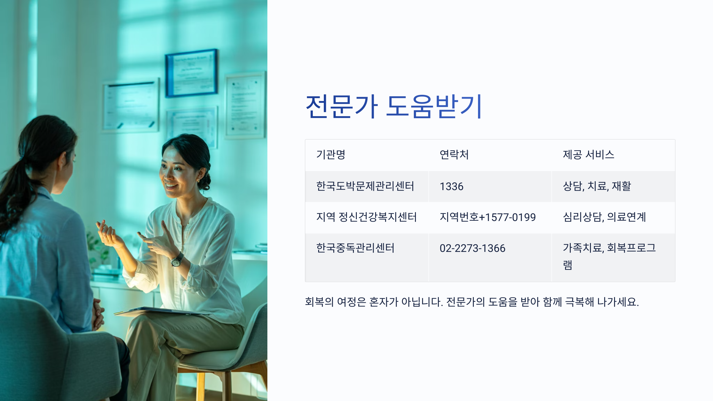 또한, 대화할 때는 상대방의 말을 중간에 끊지 않고 끝까지 들어주는 태도가 필요해요. 듣는 것만으로도 중독자 스스로 문제를 인식하는 계기가 생길 수 있어요.