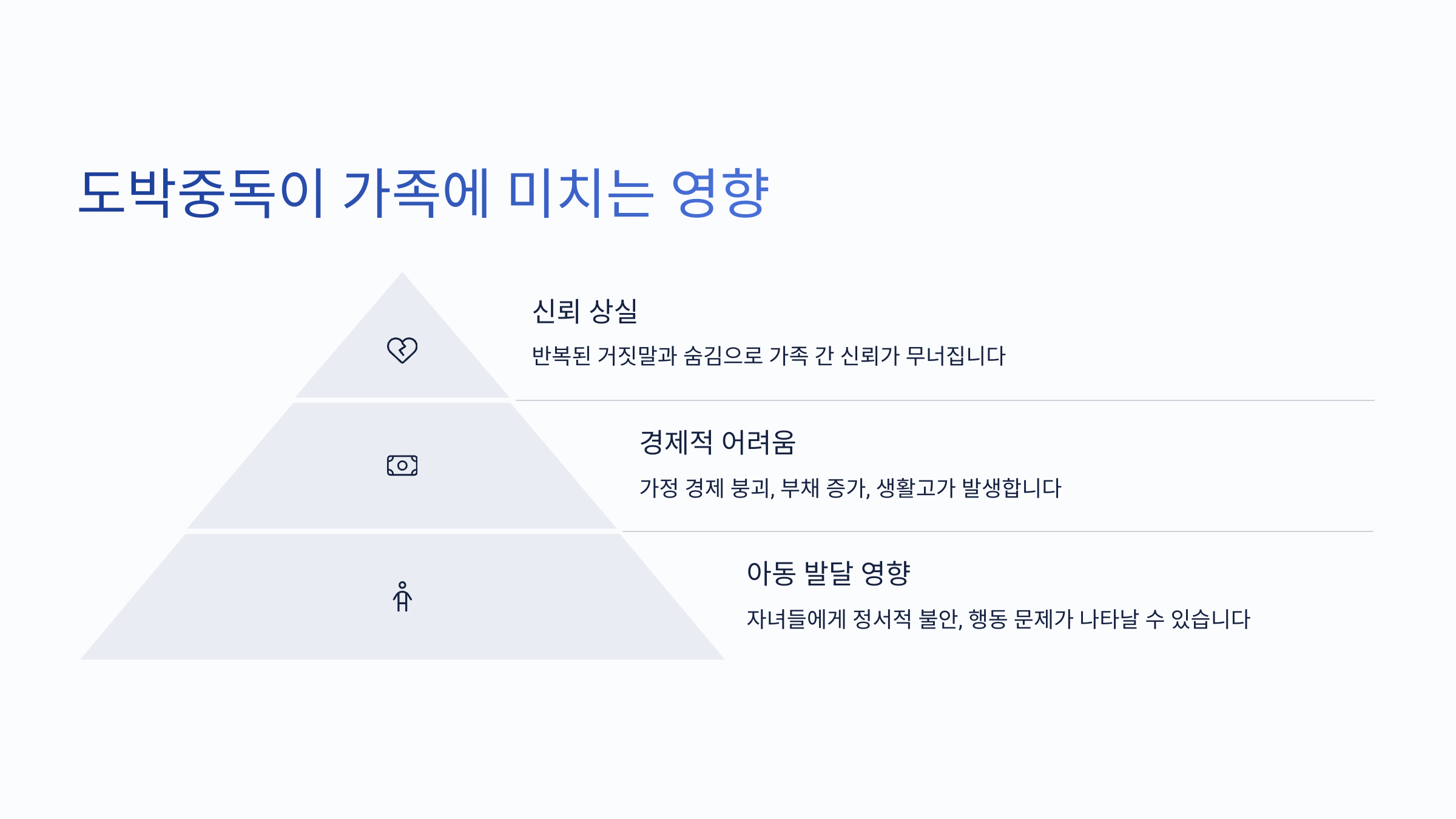 도박중독을 질병으로 인정하고 접근하는 것이 첫 번째 스텝이에요. 비난하거나 수치심을 주는 방식은 오히려 중독을 심화시킬 수 있어요. 🧠