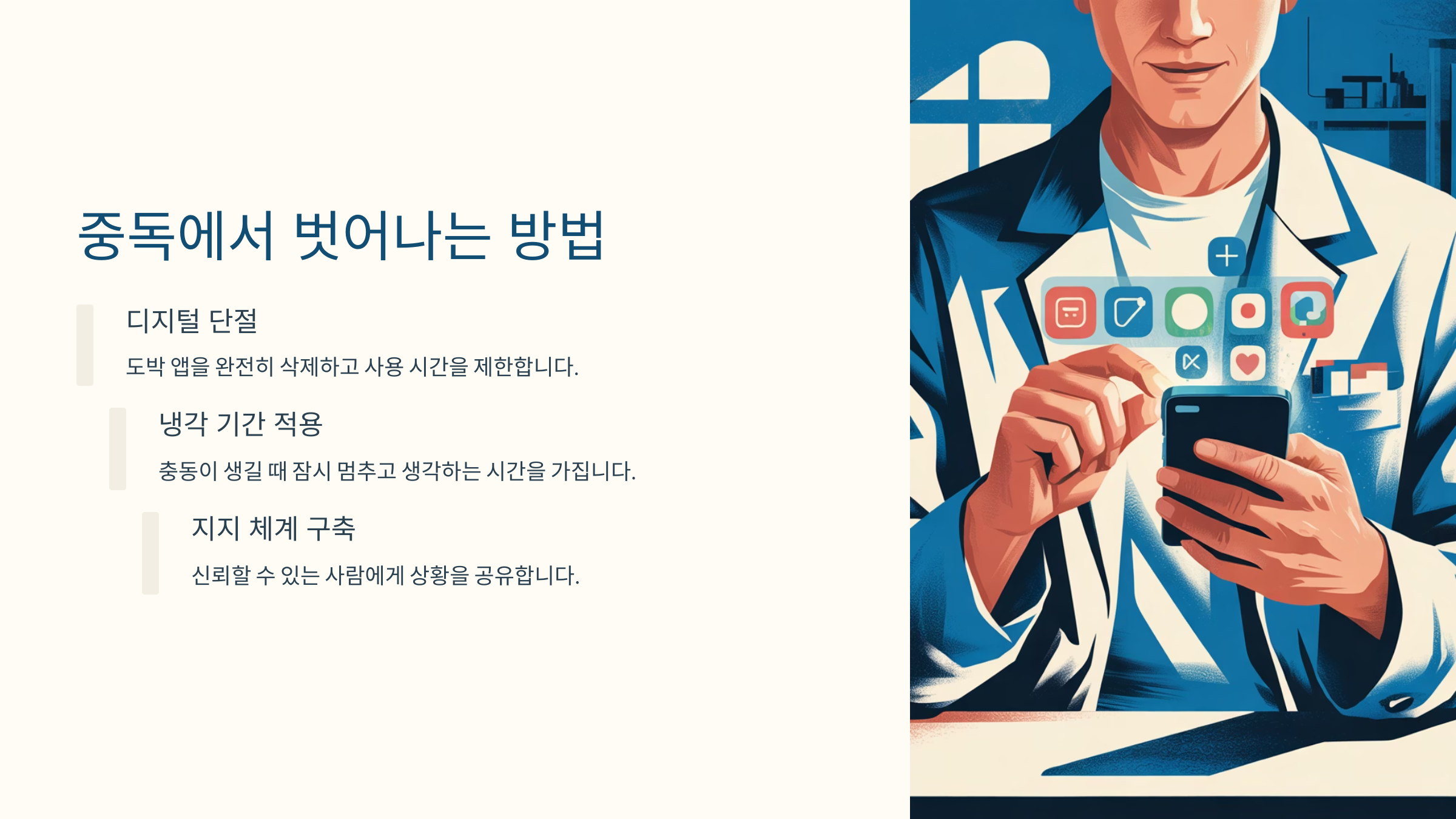 전문 상담 개인 및 가족 치료 자조 모임 동료 지지와 경험 공유 재정 재건 부채 조정 및 상담 포기하지 말고, 꼭 도움을 요청하세요. 함께라면 극복할 수 있어요!
