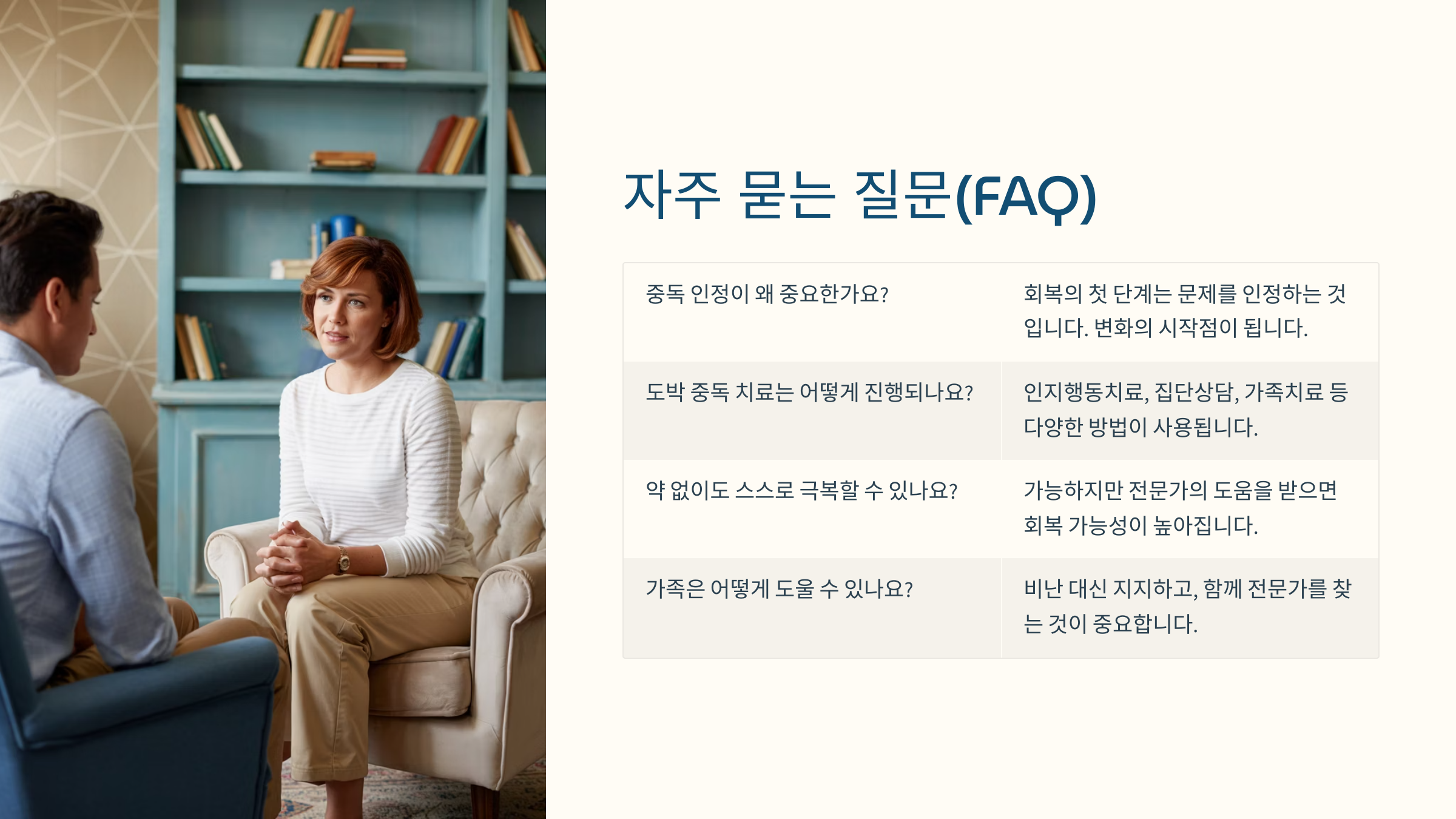 첫 번째로는 중독 전문 상담을 받는 것이 필요해요. 중독자뿐 아니라 가족 전체가 함께 상담을 받아야 해요. 상처받은 감정을 치유하는 과정이 함께 이뤄져야 하거든요.