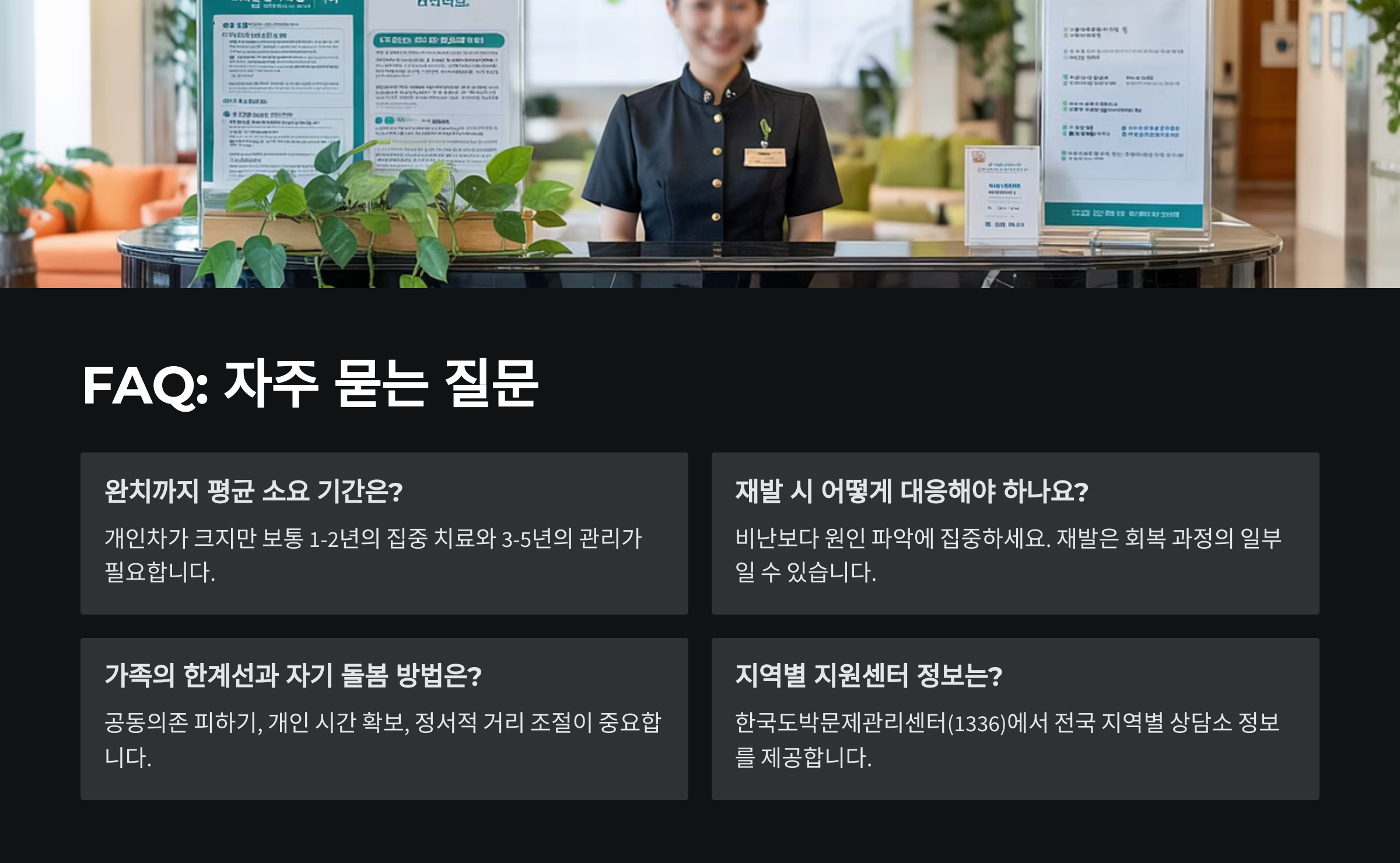 A3. 재발은 회복 과정의 일부라고 받아들이는 게 좋아요. 좌절하기보다, 왜 재발했는지 함께 분석하고 다시 계획을 세우는 게 필요해요.