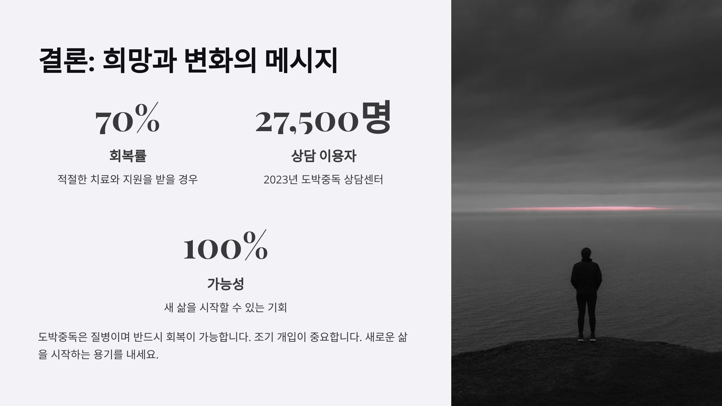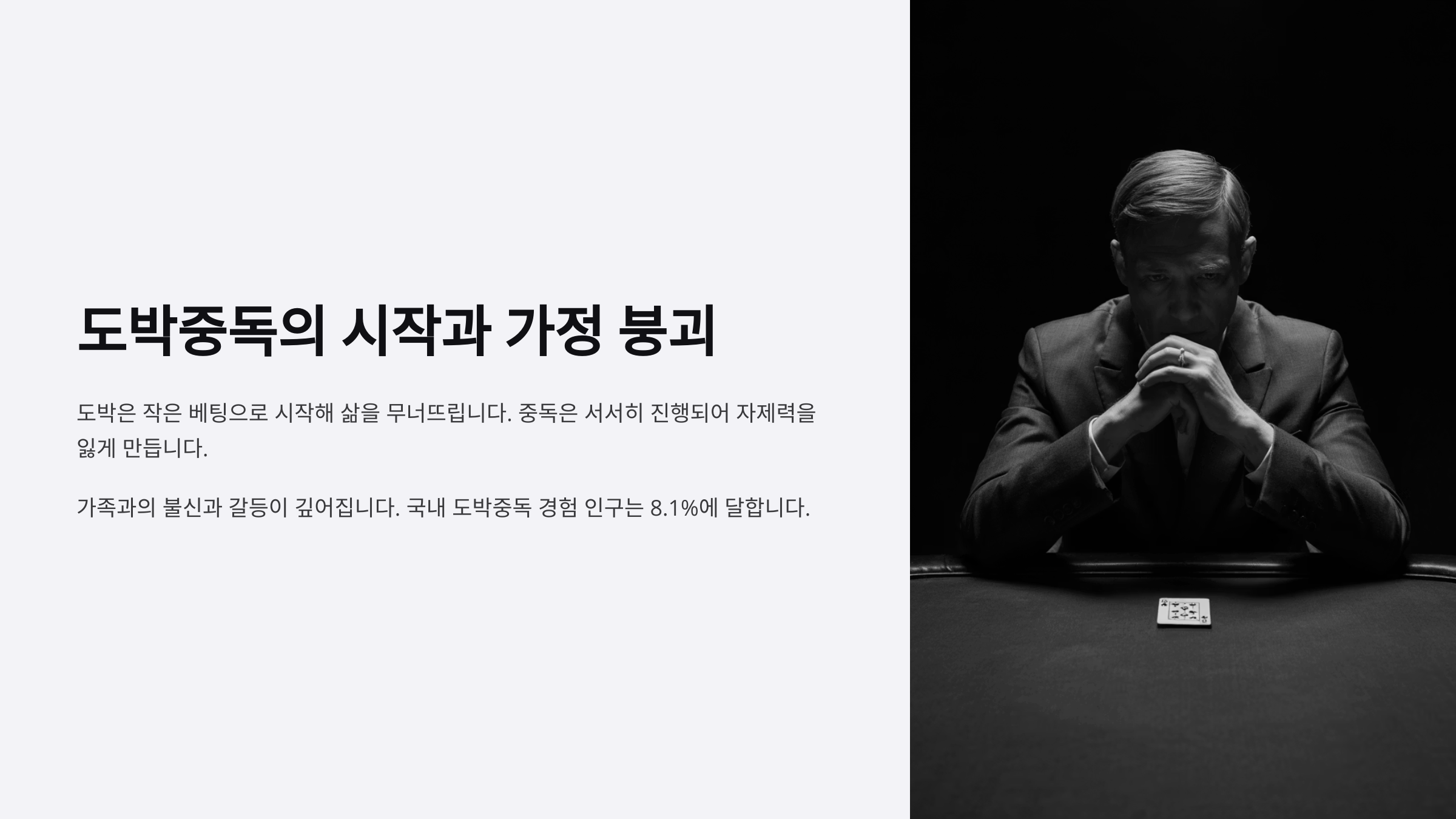 경제 빚, 파산 위기 재산 손실 정서 우울, 불안 가족 해체 위기 사회적 고립, 낙인 인간관계 단절 이 표처럼 도박은 단순한 재미를 넘어서 삶 전체를 무너뜨리는 무서운 질병이에요. 절대 가볍게 볼 문제가 아니랍니다!