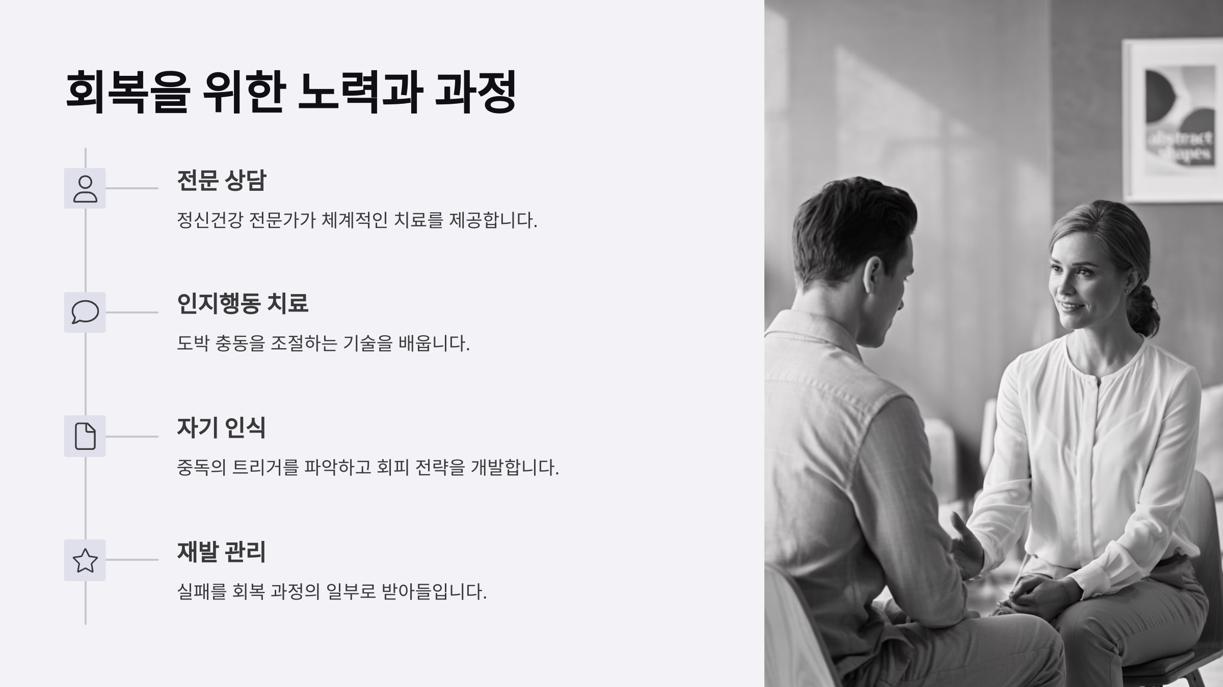 A4. 재발은 과정의 일부로 받아들이고, 다시 치료를 이어가야 해요.