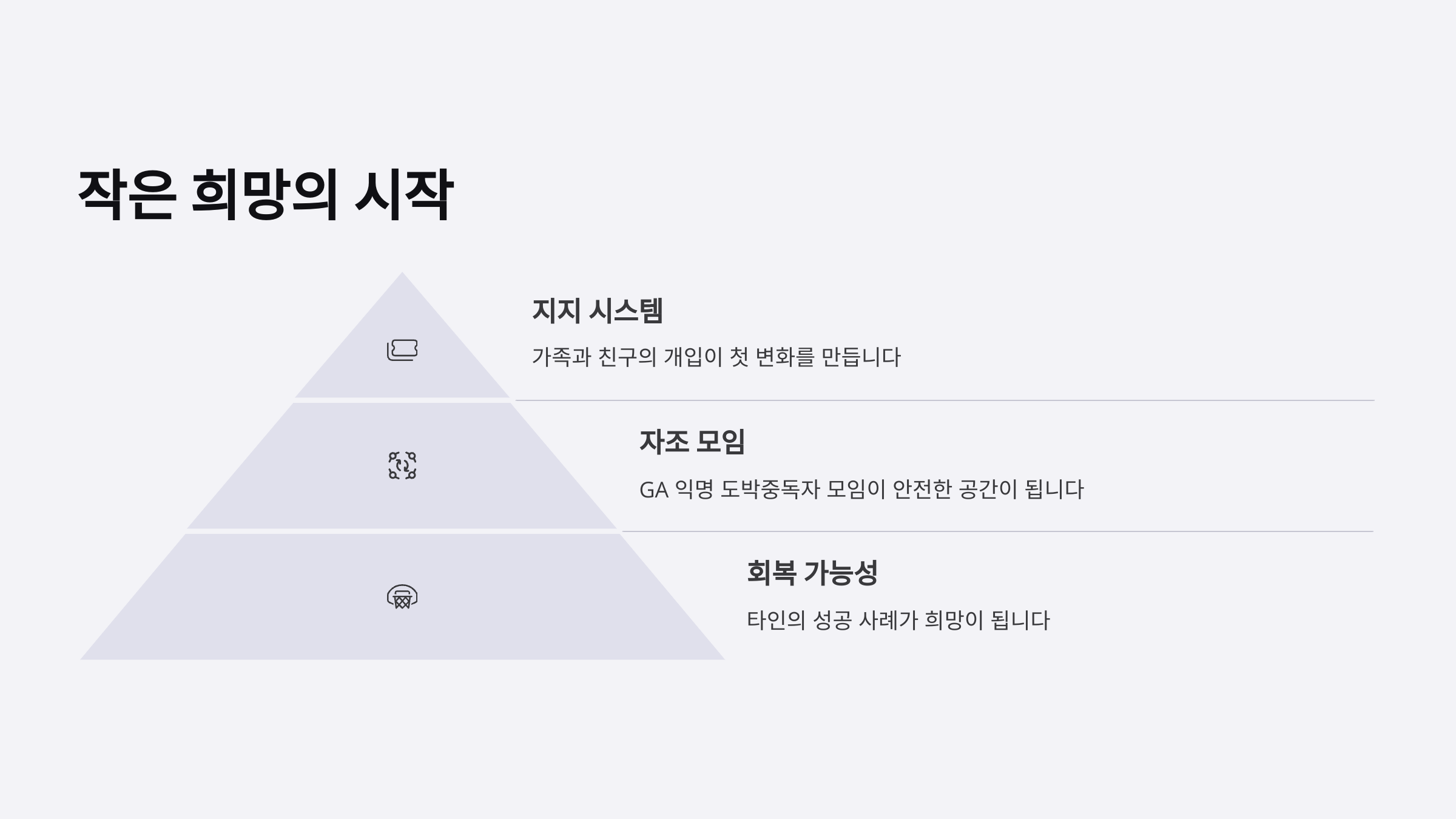 초기 재미, 스트레스 해소 목적 빈번한 소액 도박 중기 손실 만회 심리 작용 부채 증가, 가정 불화 말기 도박 없이는 일상 불가 가정 파탄, 사회적 고립 도박중독은 이렇게 천천히, 그러나 확실하게 삶을 잠식해 간답니다. 그래서 조기 발견과 개입이 정말 중요해요!