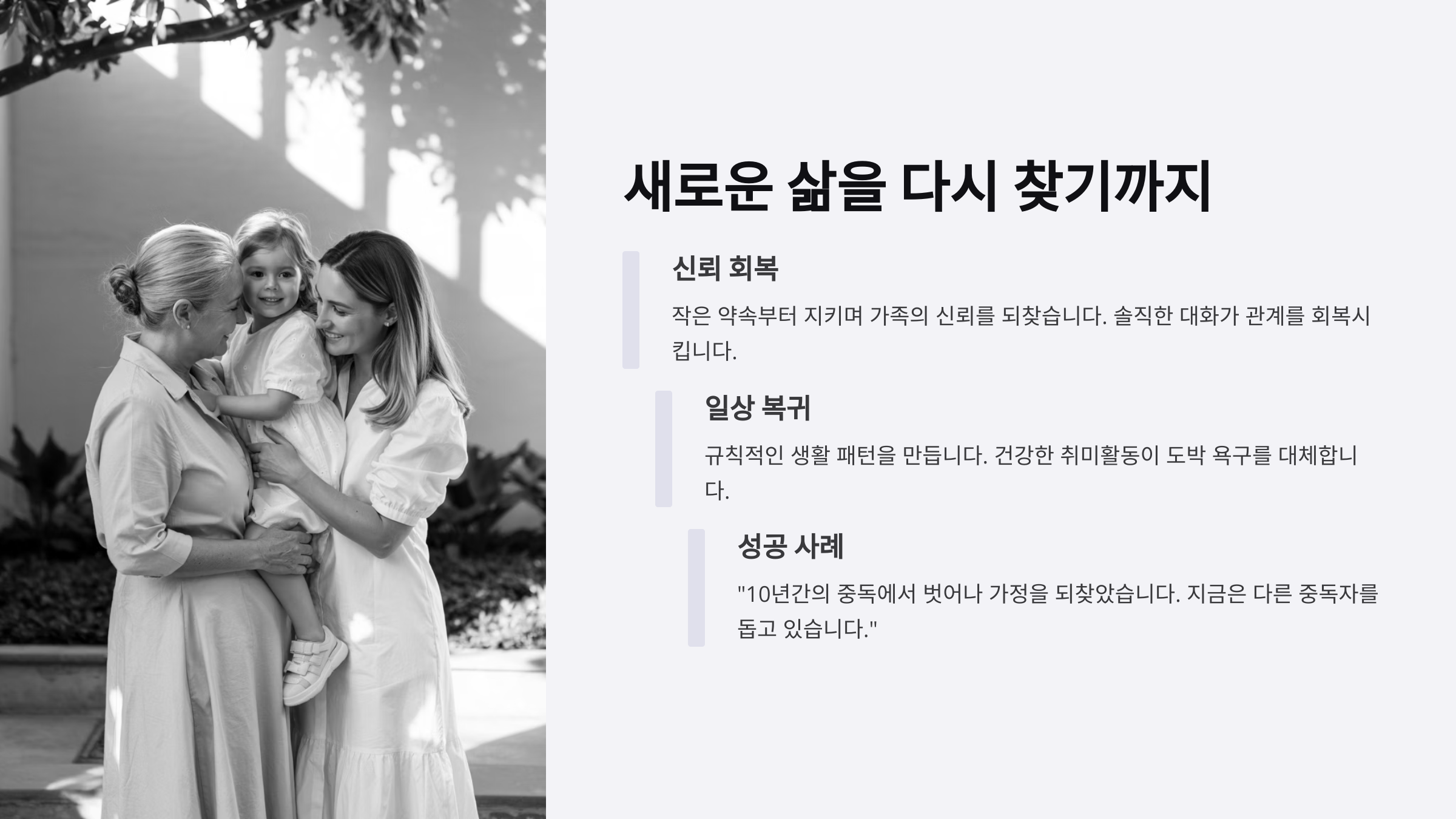1단계 상담 및 치료 정신적 안정 2단계 경제적 자립 생활 안정 3단계 가족 재결합 노력 관계 회복 조금씩 변해가는 우리 가족을 보면서 '정말 다시 웃을 수 있구나'라는 확신이 생겼어요. 그 믿음이 저를 앞으로 나아가게 했답니다.