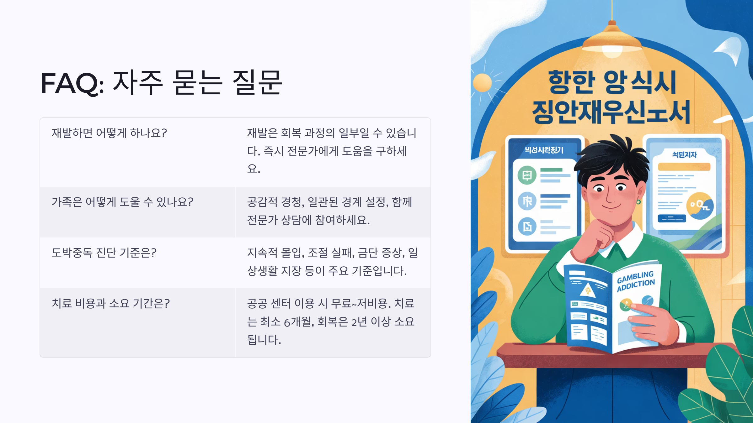 의지로 끊을 수 있다 치료와 지원이 필요한 질병이다 도박하는 사람은 나쁜 사람이다 좋은 사람도 중독될 수 있다 한 번 치료하면 완치된다 지속적인 관리가 필요하다 이 표처럼, 도박중독에 대한 인식을 바로잡는 건 정말 중요해요. 다음은 여러분이 많이 궁금해할 만한 질문을 모은 FAQ 섹션으로 넘어가 볼게요!❓