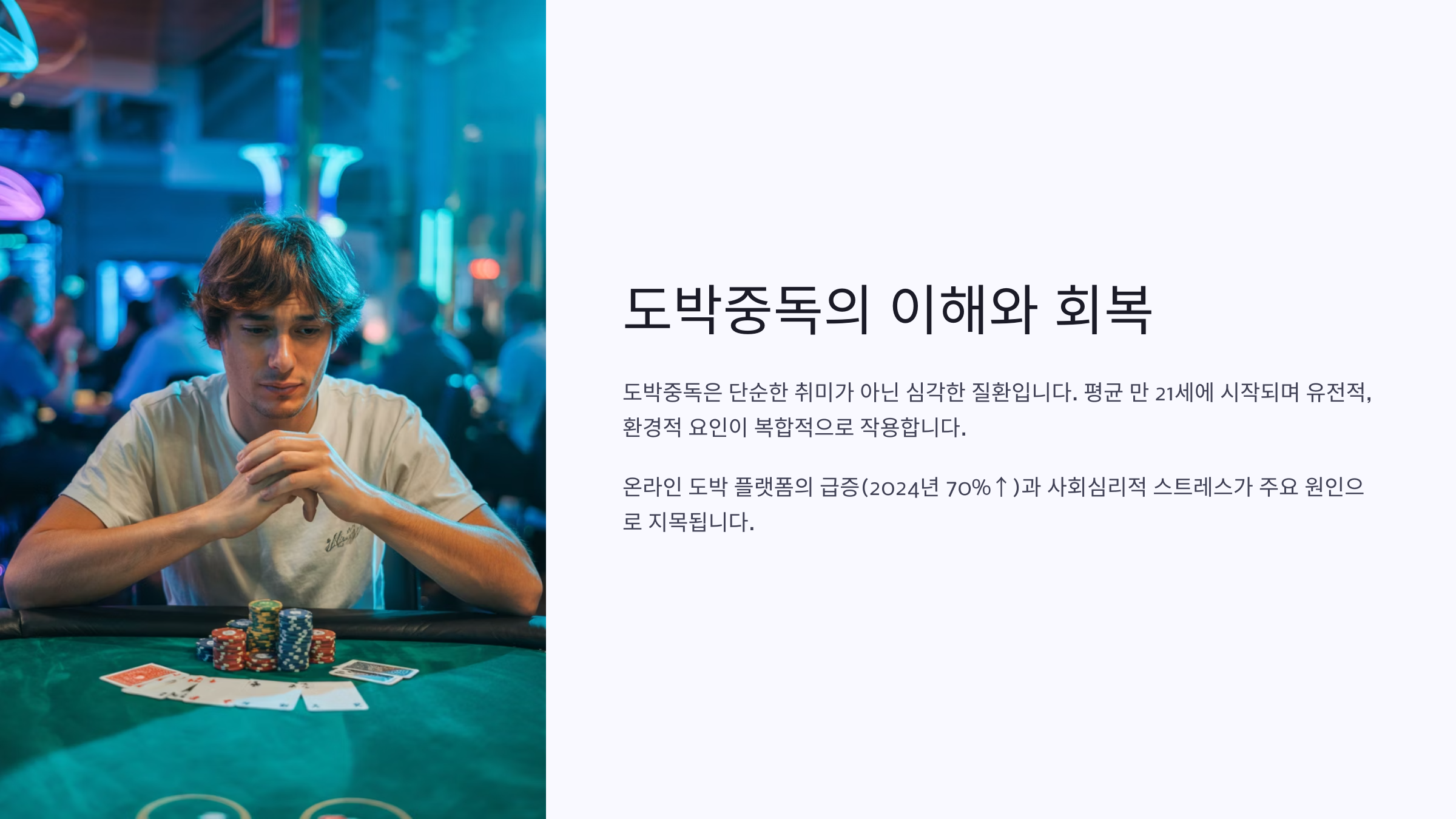 자, 이제 본격적으로 도박중독의 뿌리부터 회복까지 차근차근 이야기해 볼게요. 다음 섹션부터는 중독의 시작과 배경에 대해 살펴볼 거예요.👇