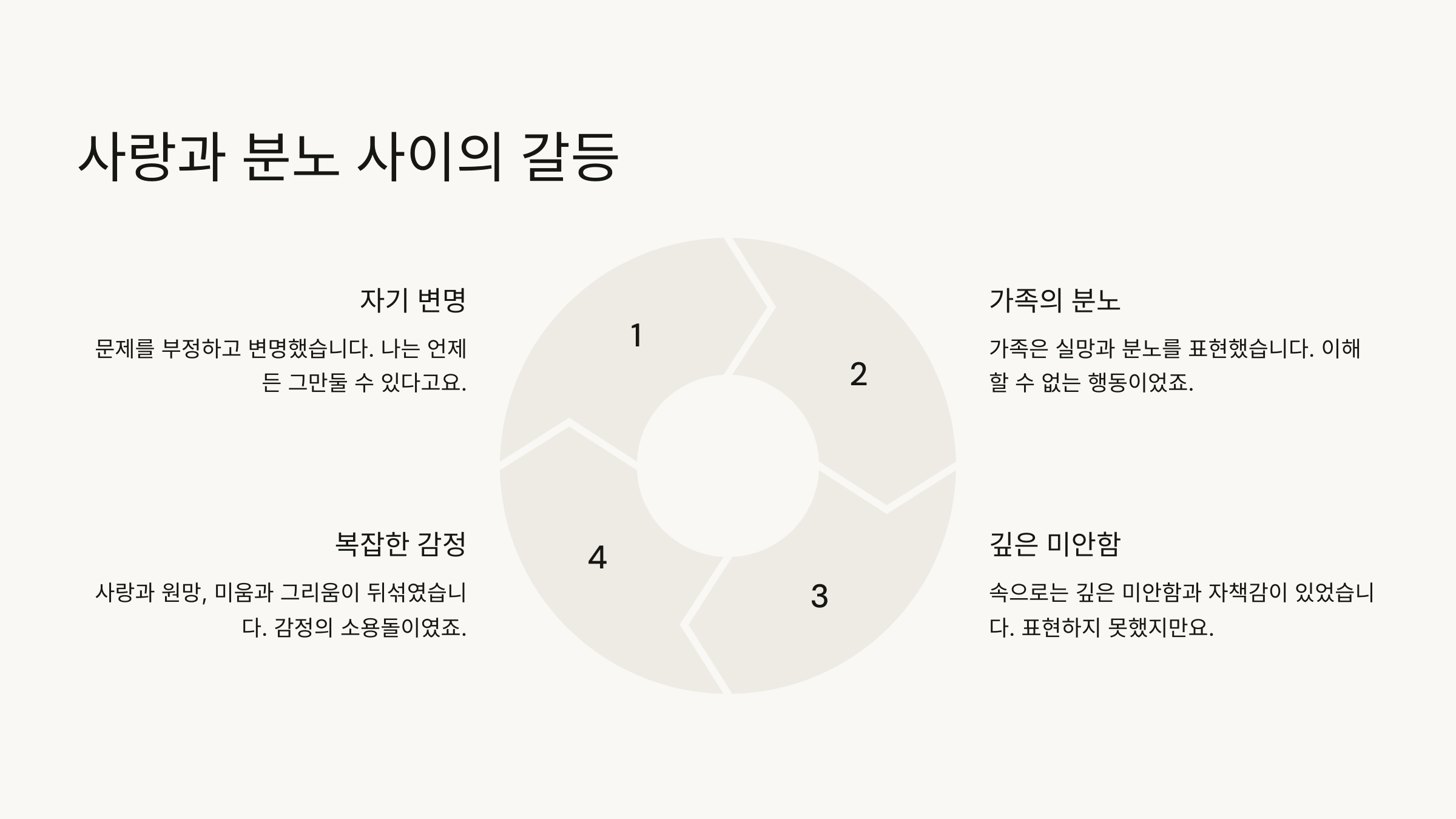 가족이라는 이유만으로 모든 걸 이해하고 넘어가기에는, 마음속 분노가 너무 컸어요. 한편으로는 '그래도 가족이니까'라는 생각이 들면서도, 또 한편으로는 '왜 우리 가족을 이렇게 망치는 거야?'라는 원망이 치밀었어요.