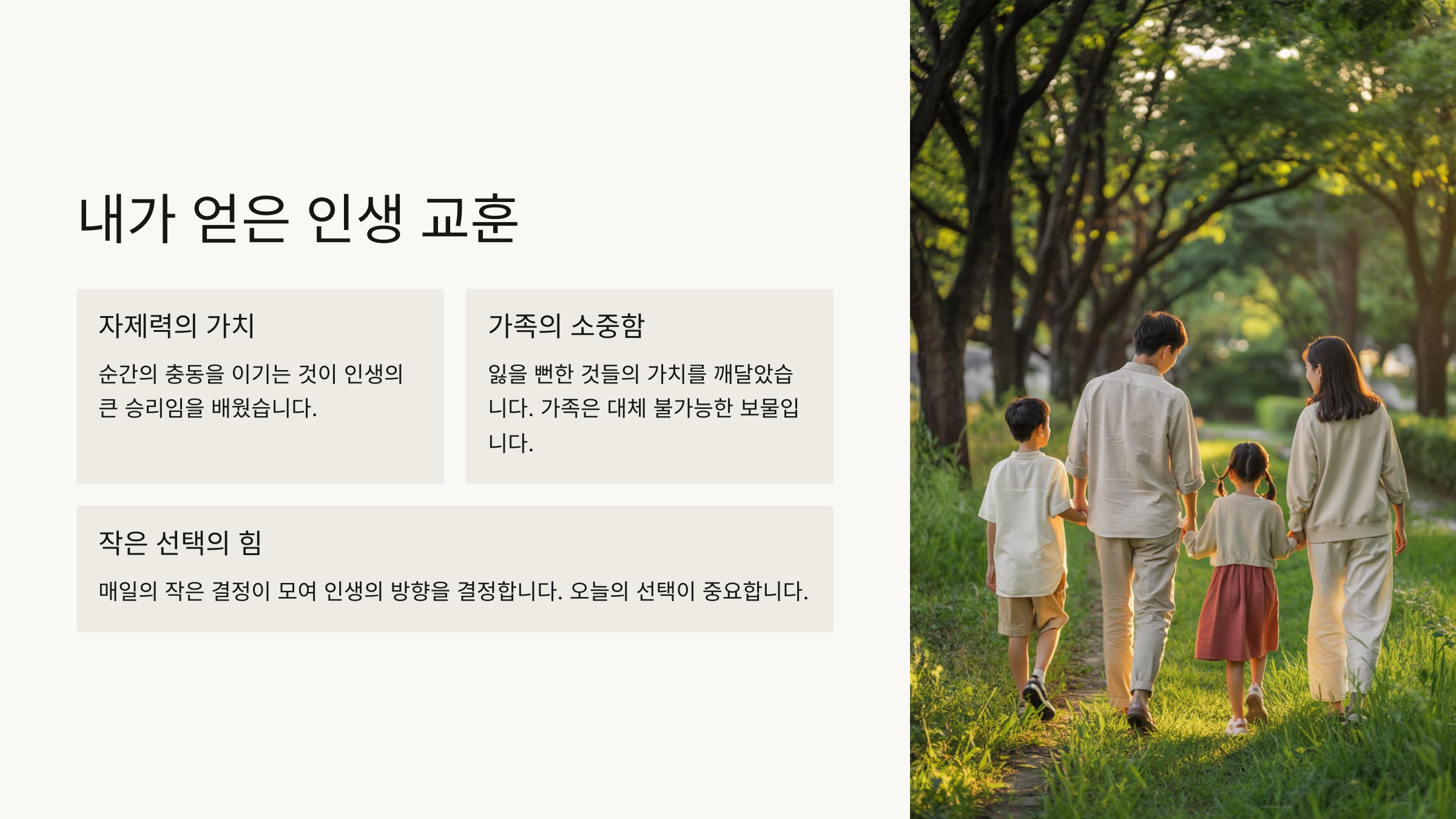 2025년인 지금, 돌이켜보면 그 시절의 선택이 지금의 저를 만들었다고 생각해요. 나에게 무엇보다 소중했던 것은 가족이라는 이름이었거든요. 하지만 때로는 단호한 결단이 필요한 순간도 있었어요.