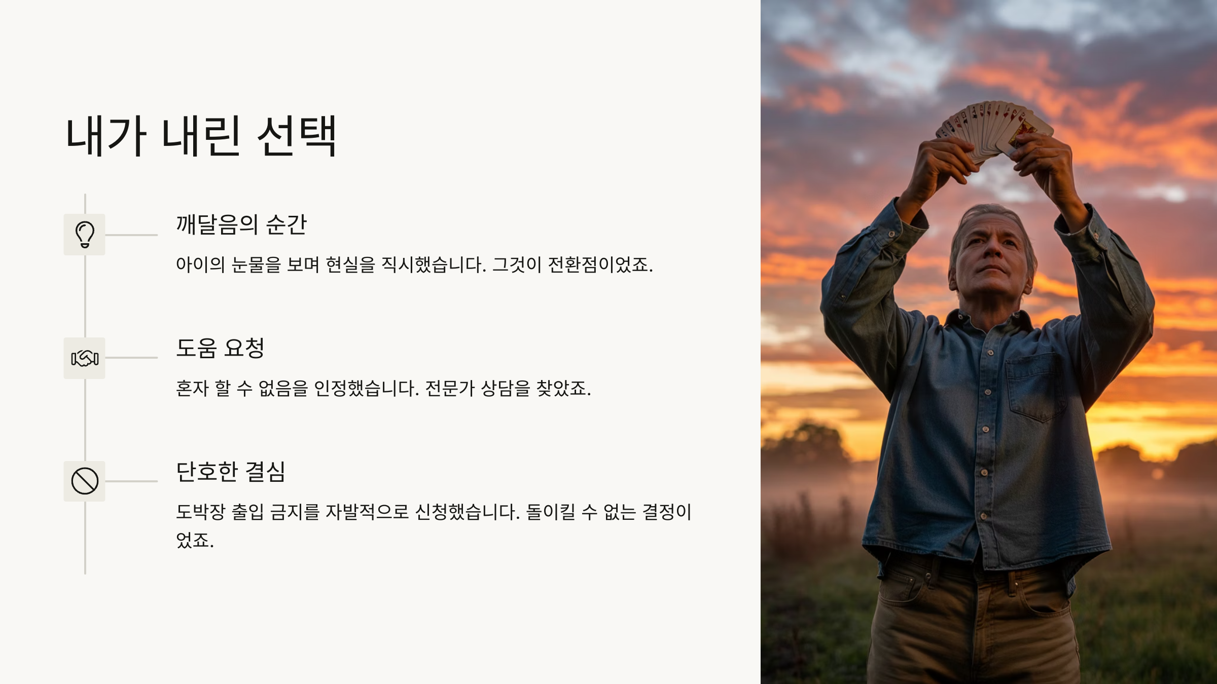 도박은 단순히 돈 문제만이 아니라 가족 간의 신뢰를 깊이 파괴해요. 저는 도박이 가져온 무서운 파괴력을 온몸으로 느껴야 했어요. 그 과정 속에서 사랑과 분노 사이에서 갈등하며 많은 고민을 했답니다.
