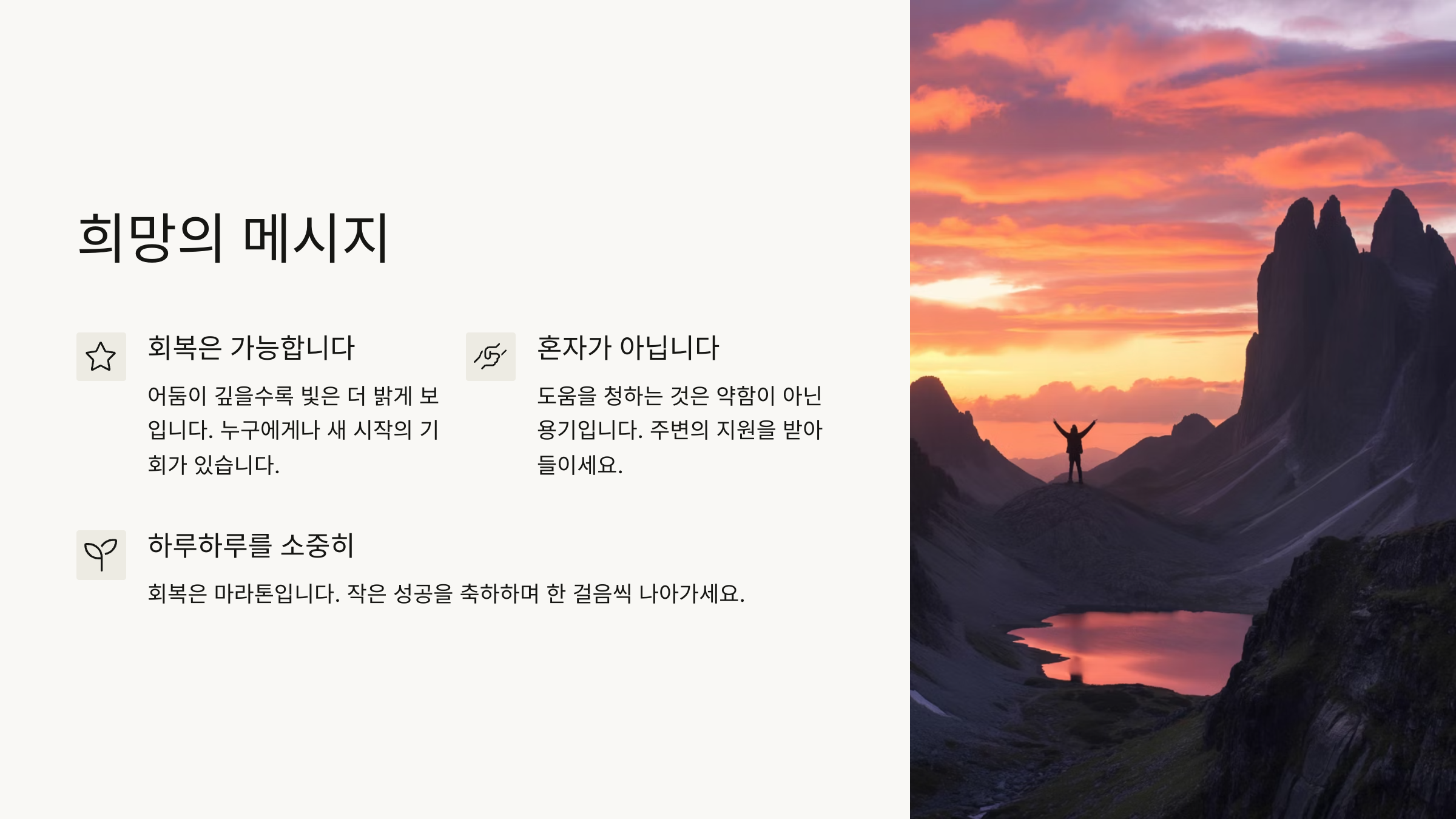 또한, 치유에는 시간과 용기가 필요하다는 것도 배웠어요. 아무리 힘들어도 '나아지고 싶다'는 마음이 있다면, 한 걸음 한 걸음 갈 수 있어요. 그리고 그 여정 끝에는 분명 더 강해진 내가 있더라고요.