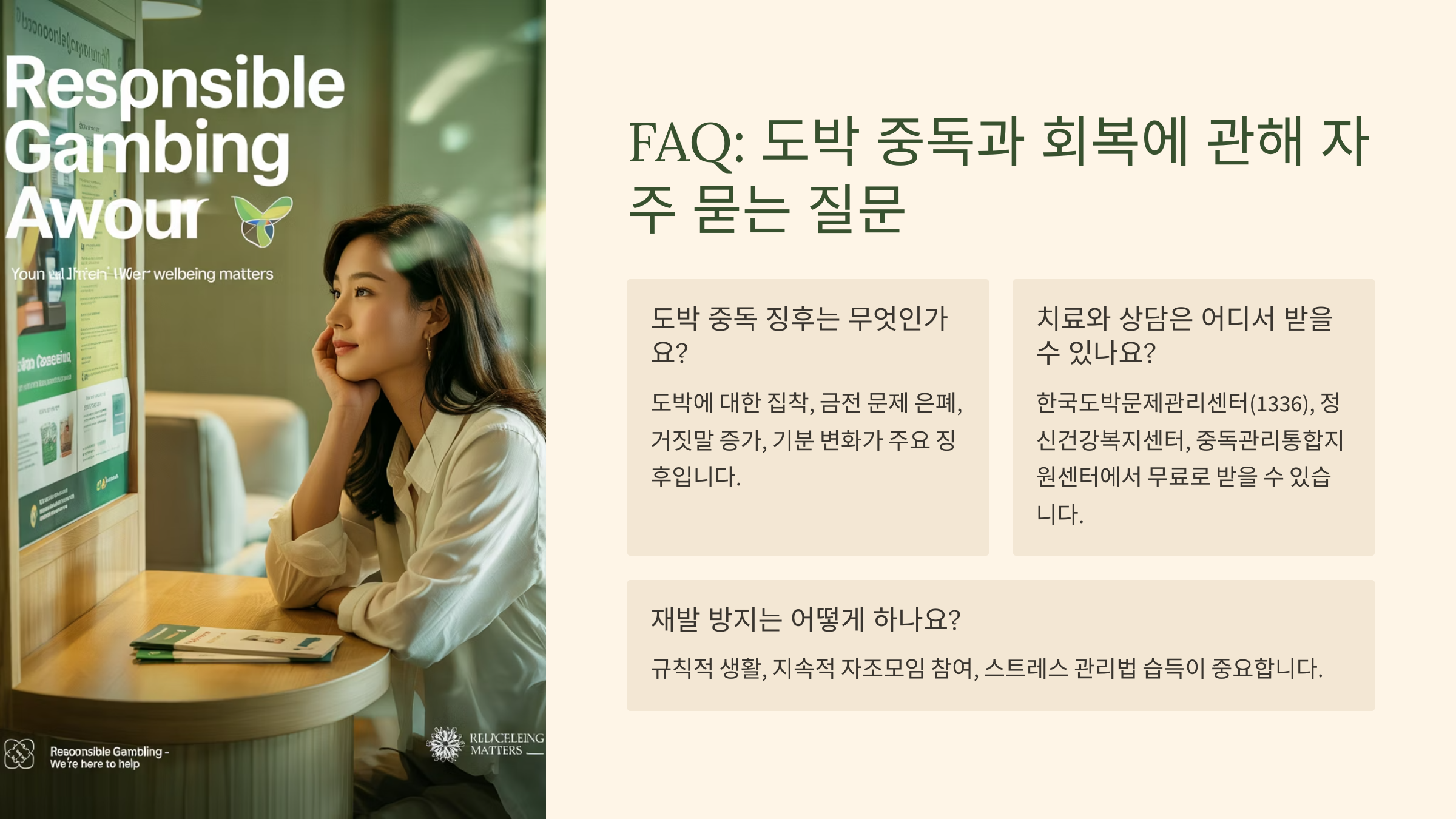 나는 더 이상 ‘참는 아내’가 아니라, 선택하고 행동하는 사람이 되었어요. 도박 문제를 겪는 가족들에게 꼭 말해주고 싶어요. 그냥 견디는 게 답이 아니에요. 나 자신을 지키면서 방법을 찾을 수 있어요. 혼자 하지 마세요. 도움을 받는 게 약한 게 아니라, 용기예요.