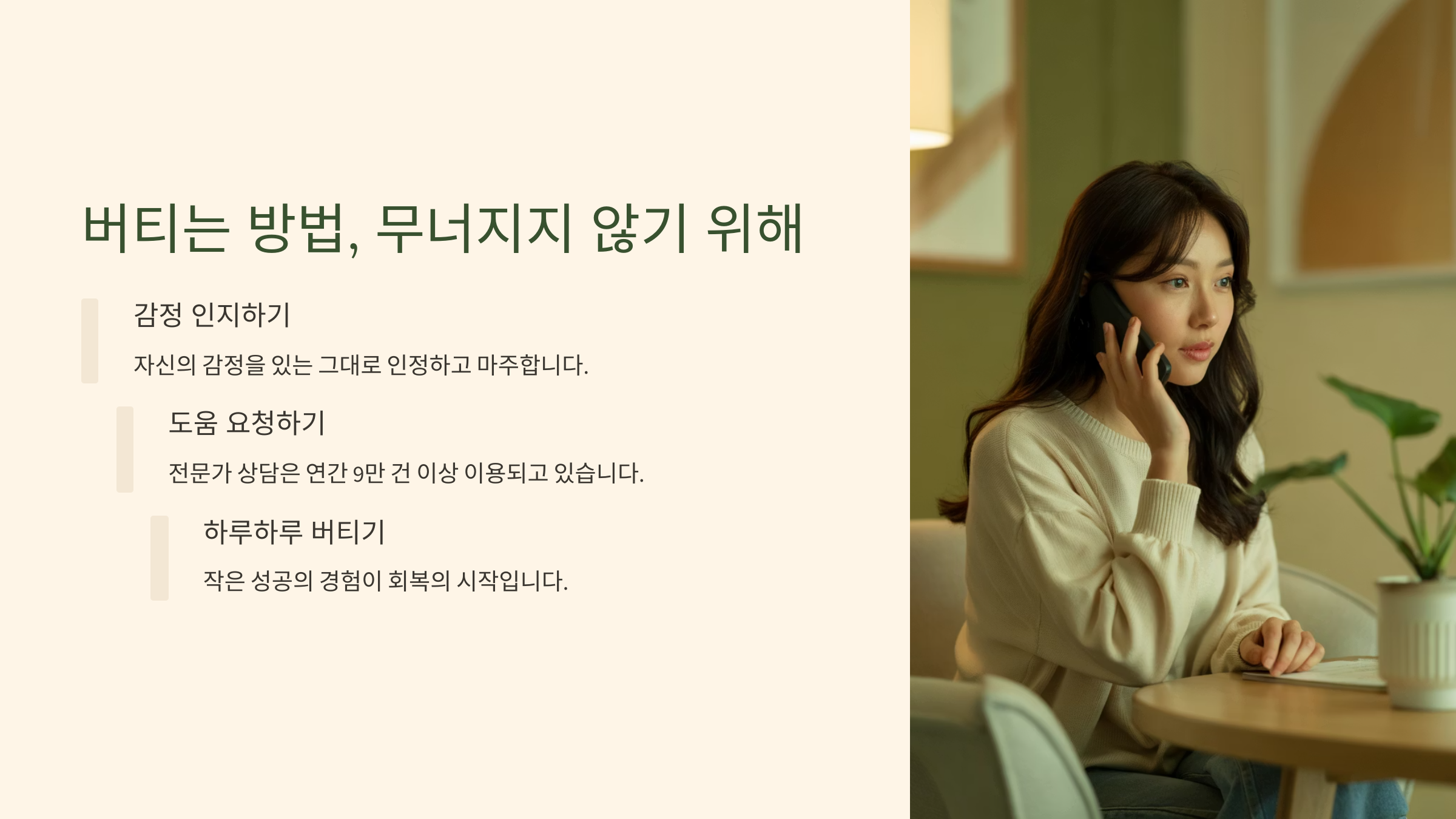 친정엄마 정서적 위로, 가사 지원 따뜻함, 버팀목 같은 존재 온라인 커뮤니티 언니 경험 공유, 공감 외롭지 않다는 위로 상담사 심리치유, 감정정리 죄책감에서 벗어남 사람은 결국 사람으로 인해 살아가는 것 같아요. 힘든 시간을 이겨내는 데 있어 내가 기댈 수 있었던 존재들이 있었기에 버틸 수 있었어요. 혼자가 아니라는 감정, 그것이 나를 지탱해 줬어요.