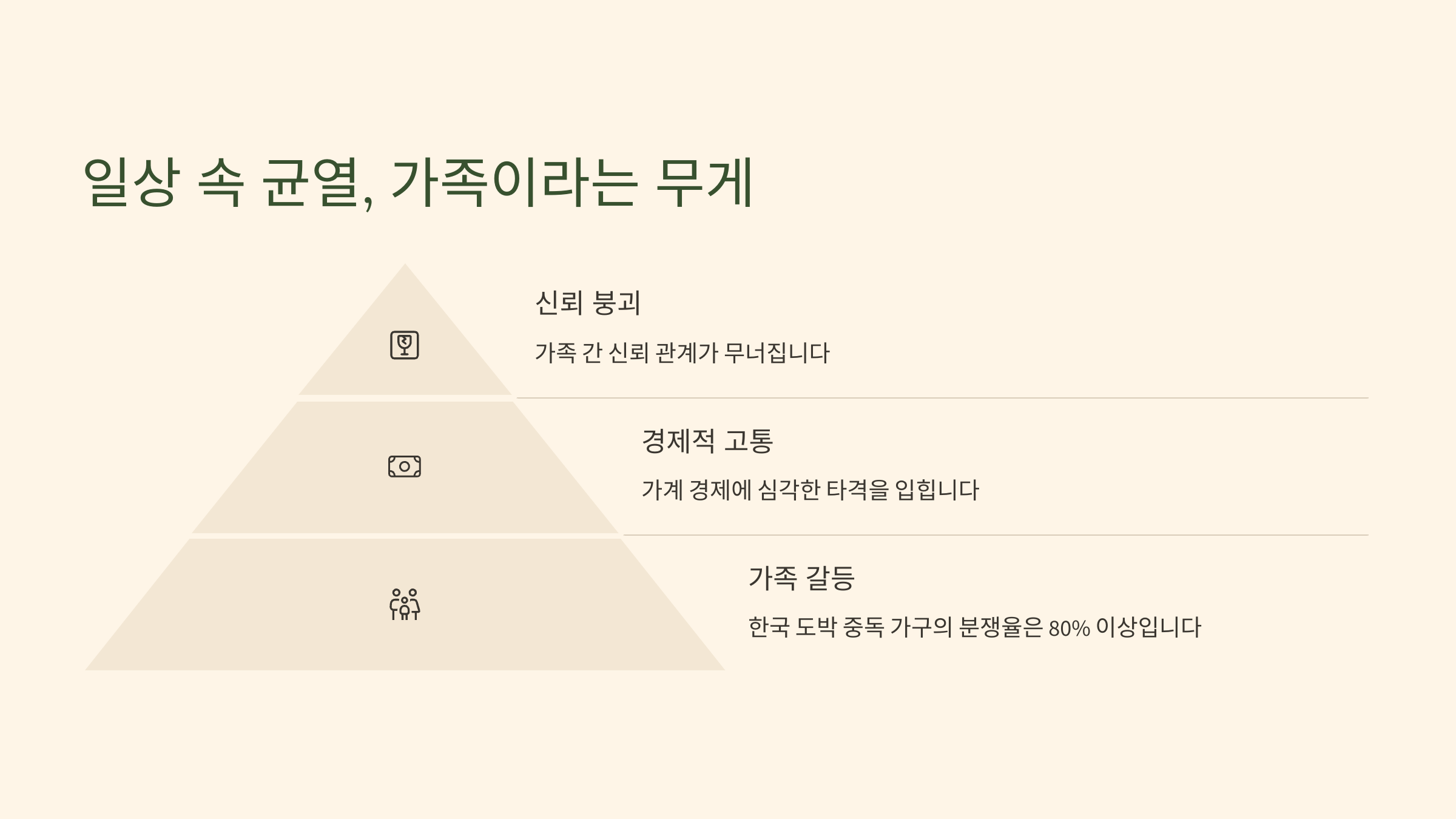 남편 평범함 감정 기복 심함, 무기력 아내(나) 조금의 스트레스 불안, 분노, 우울 아이 밝고 안정적 불안정, 집중력 저하 우리 가족은 도박을 겪으며 전혀 다른 얼굴을 가지게 됐어요. 평범했던 일상이 깨졌고, 아이의 웃음은 줄었고, 나는 늘 화를 억누르며 살게 됐죠. 그 와중에도 나는 엄마로, 아내로, 사람으로 버텨야 했어요.