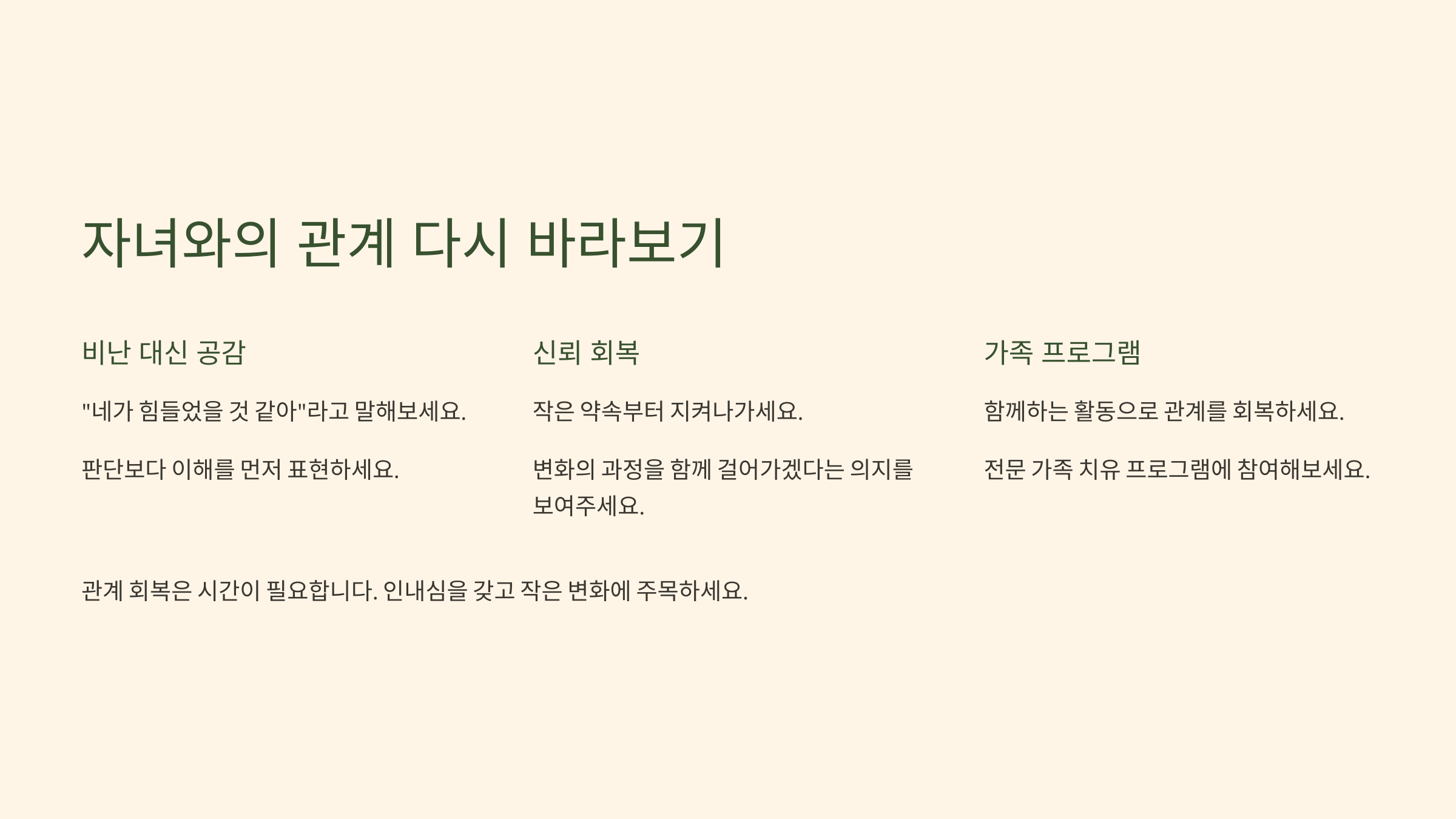 관계를 회복하는 데는 시간이 필요해요. 조급해하지 않고, 천천히 자녀가 다시 일어설 수 있도록 곁을 지켜주는 것, 그것이 부모가 줄 수 있는 가장 큰 선물이에요.🌈