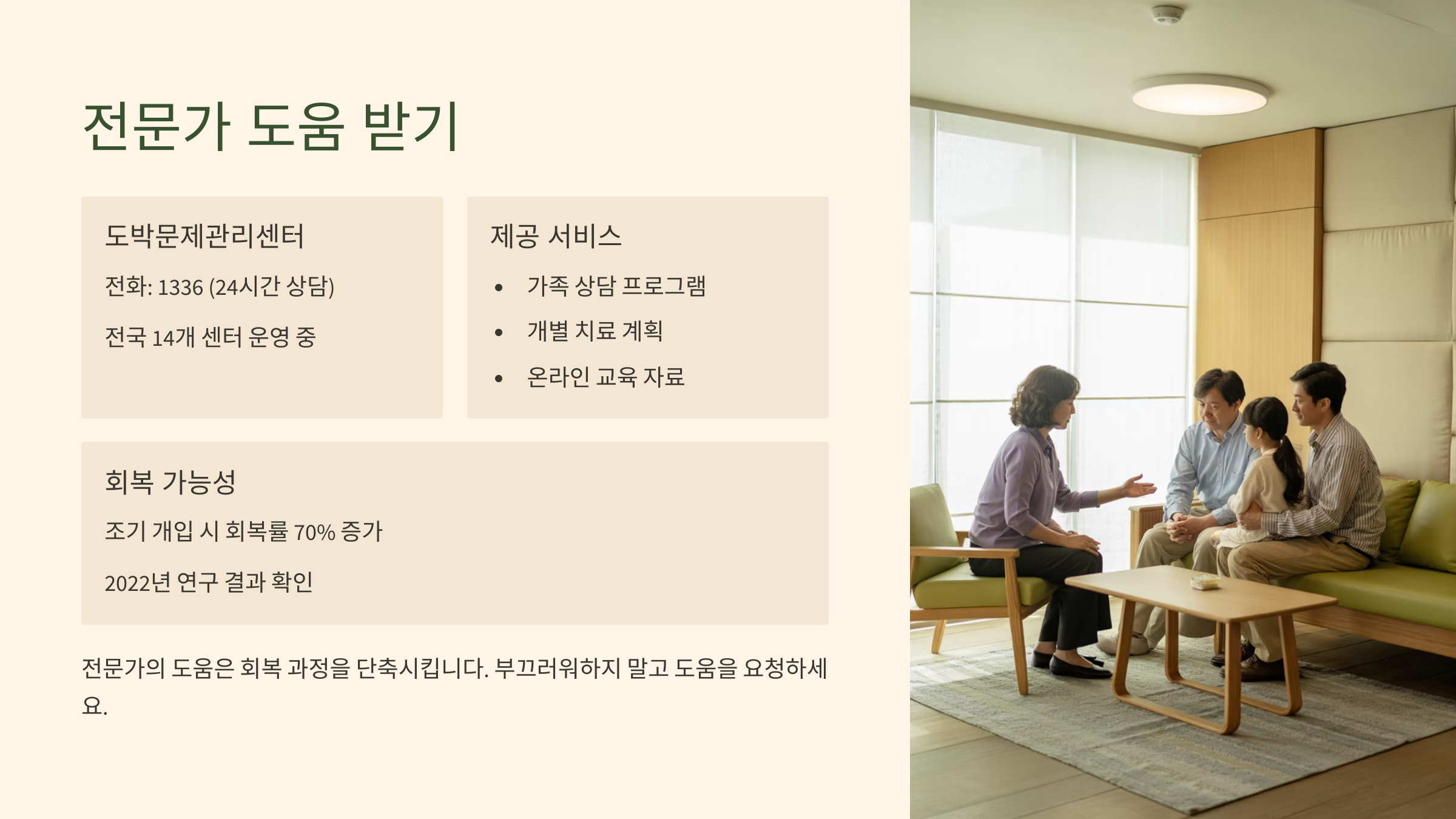 상담 심리사, 정신과 의사, 중독 전문 센터 등 다양한 기관에서 도움을 받을 수 있어요. 특히 도박 중독은 스스로 극복하기 쉽지 않기 때문에 초기 단계부터 전문가와 함께 계획을 세워나가는 게 좋아요.🌼