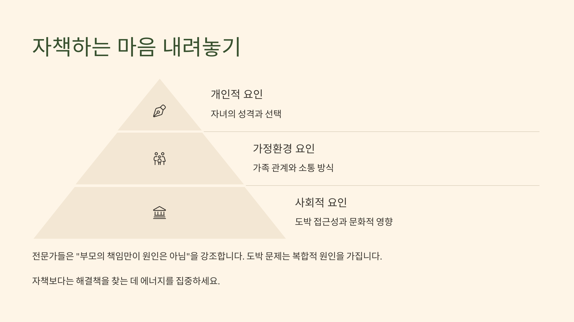 도박에 빠진 자녀를 볼 때 가장 먼저 드는 감정 중 하나는 '내 탓'이라는 생각이에요. "내가 더 잘 가르쳤어야 했는데", "내가 신경을 더 썼어야 했는데" 같은 후회가 끊임없이 밀려오죠. 하지만 여기서 꼭 기억해야 할 게 있어요. 인생의 모든 선택은 결국 그 사람 자신의 몫이라는 거예요.