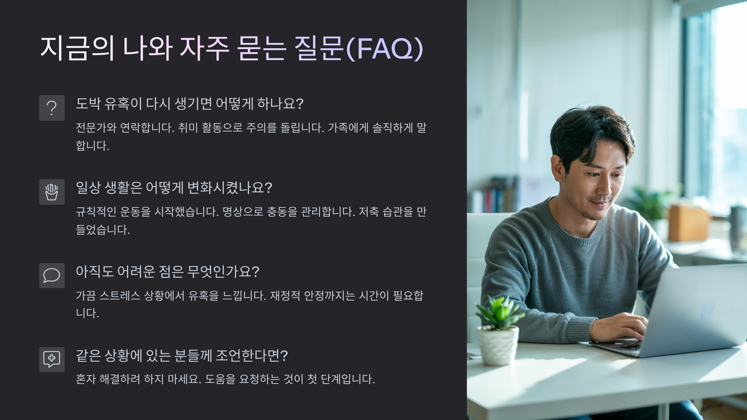 A8. 회복은 충분히 가능해요. 단, 시간과 노력이 필요해요. 저처럼 도박을 끊고 새로운 삶을 사는 사람들도 많아요. 절대 포기하지 마세요!