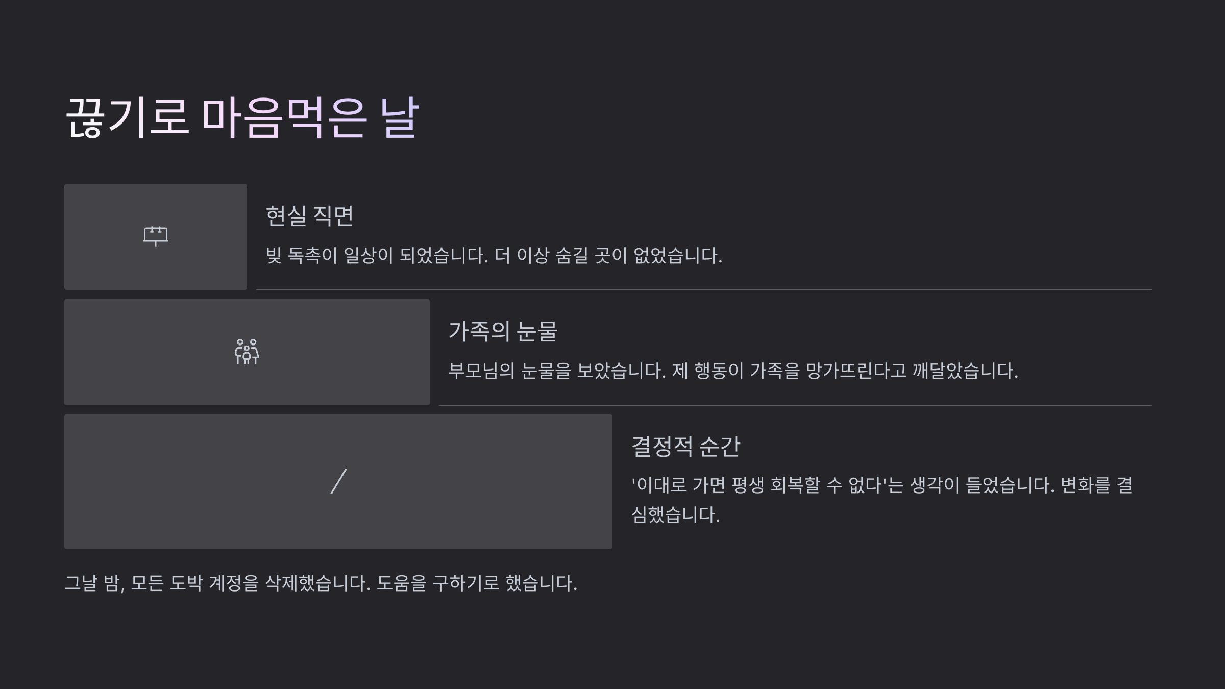 어느 날도 도박으로 밤을 새우고, 아침에 일어나 보니 카드사에서 4건의 문자와 연체 알림이 와 있었어요. 그날따라 마음이 너무 무겁고, ‘이젠 진짜 못하겠다’는 생각이 들었어요. 그렇게 정신과 예약을 걸었고, 인생의 전환점이 시작됐죠.