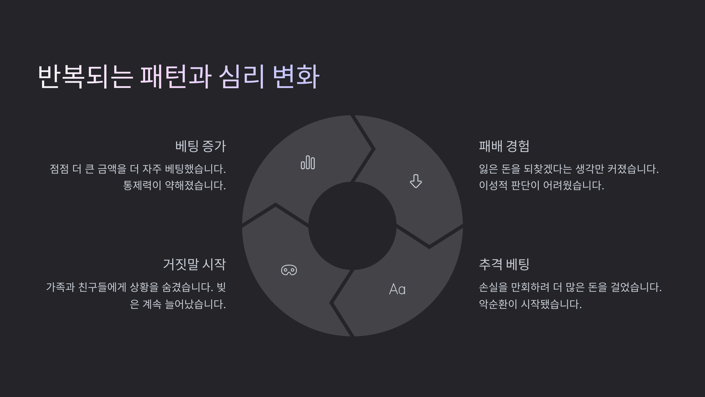 가장 무서운 건, 생활이 도박 중심으로 바뀐다는 거예요. 가족, 친구, 일보다 도박이 우선이었고, 다른 모든 건 관심 밖이었어요. 그때부터 내 삶이 조금씩 망가져 가고 있었던 거죠.