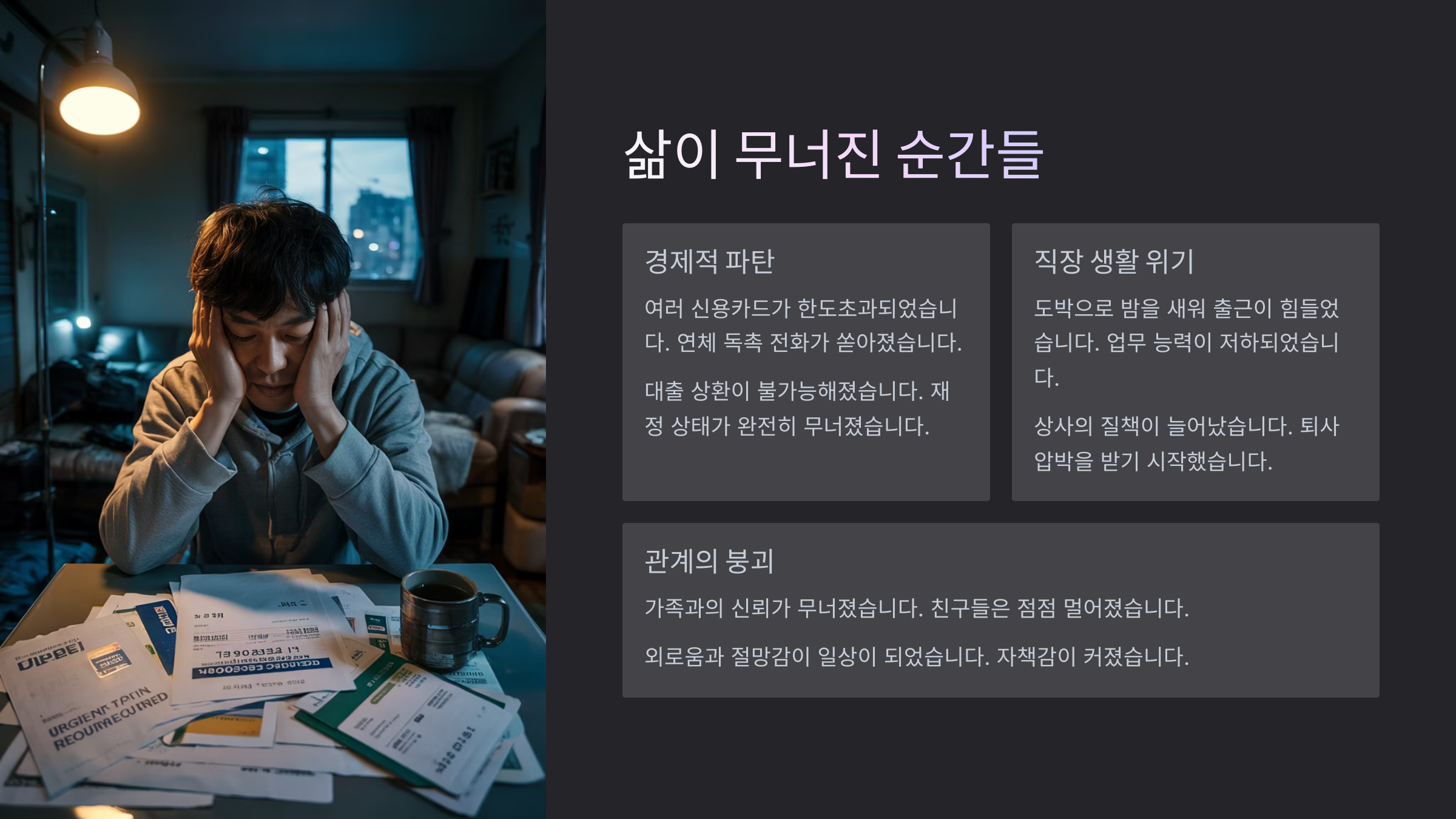 이후로 내 삶은 완전히 바뀌었어요. 연체된 카드값, 숨겨야 할 비밀, 통장의 마이너스. 주변 사람들에게 거짓말을 반복하게 됐고, 어느새 나 자신이 너무 싫어졌어요. 이 상태로는 더 이상 못 살겠다는 생각만 들었어요.